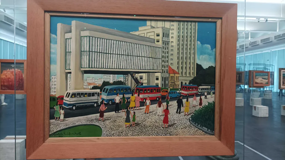 Na companhia do meu colega e amigo @Gui.N e tendo como guia dessa jornada a nossa curiosidade, começamos a visita pelo edifício Lina Bo Bardi. Fomos diretamente ao segundo andar, onde logo me deparei com obras que destacavam cores, texturas e histórias e logo notei algumas peças que destacavam a vida e o cotidiano ao redor do edifício, quando ele foi criado.