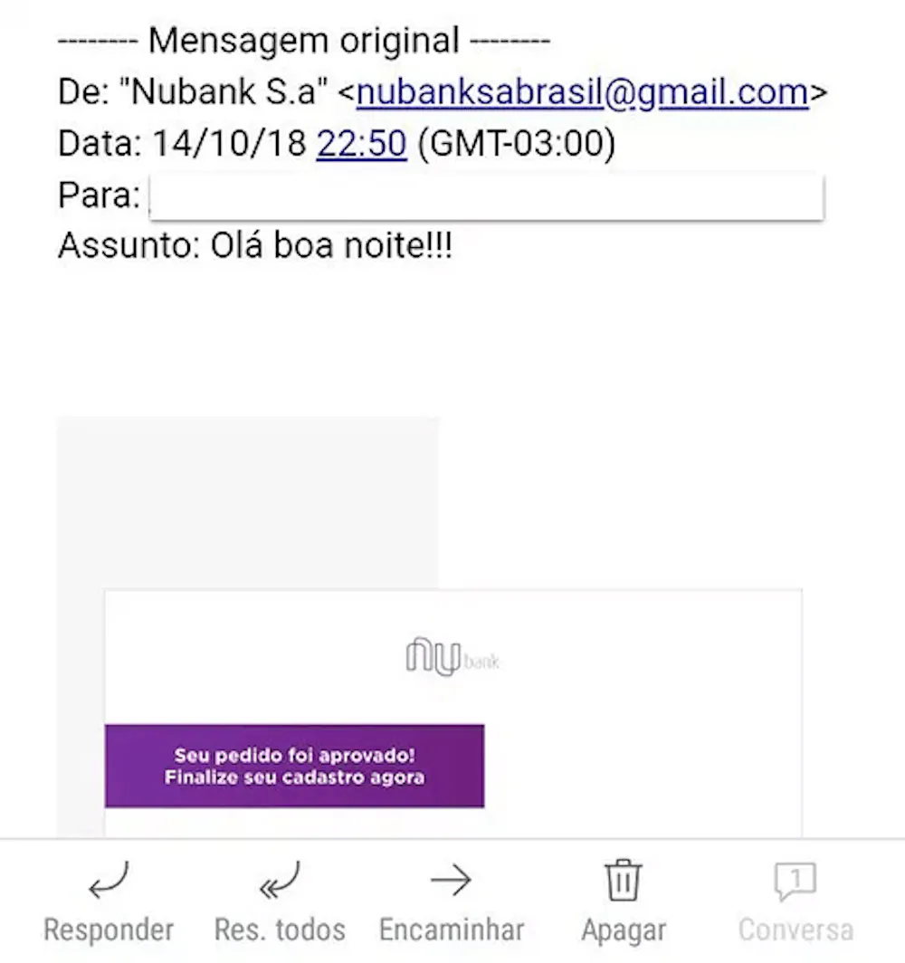 Desconfie de mensagens enviadas por canais não-oficiais do Nubank. Só enviamos e-mails pelo domínio @nubank.com.br. Além disso, nosso app só deve ser baixado nas lojas oficiais: App Store ou Play Store.