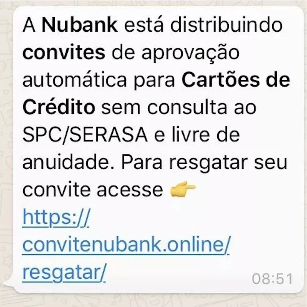 Mensagens no WhatsApp, Facebook ou qualquer outra rede social distribuindo convites assinados pelo Nubank são falsas. O pedido do nosso cartão pode ser feito pelo site nubank.com.br/cartao ou através de um link indicado por algum amigo ou conhecido que já seja cliente e te mande o convite. Viu um link e ficou na dúvida? Pode entrar em contato com a gente para checar se ele é verdadeiro antes de sair preenchendo cadastros.