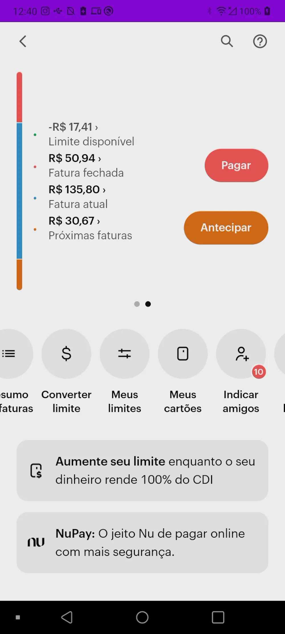 Minha pergunta é: Caso eu pague hoje a fatura fechada, esse valor de 50,94 meu limite de crédito volta a ser esse valor pago ou ainda vai descontar do limite esses R$ -17,41? Sobrando apenas R$ 33.53 de limite após essa operação?