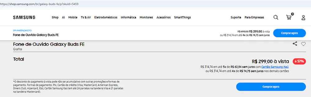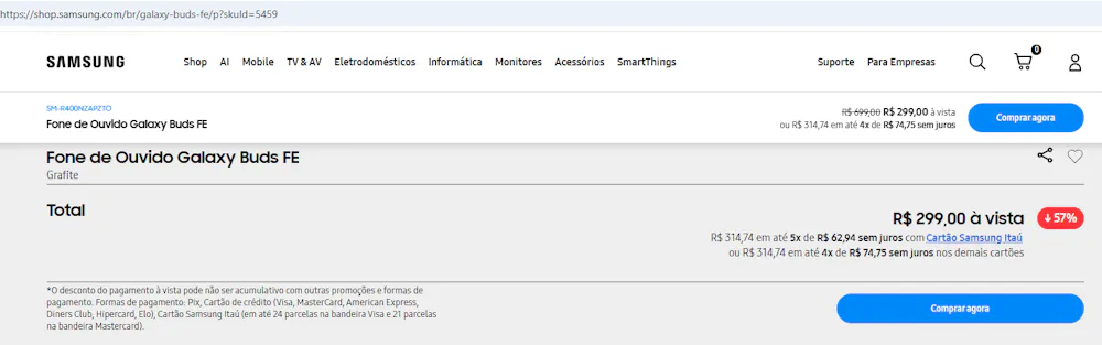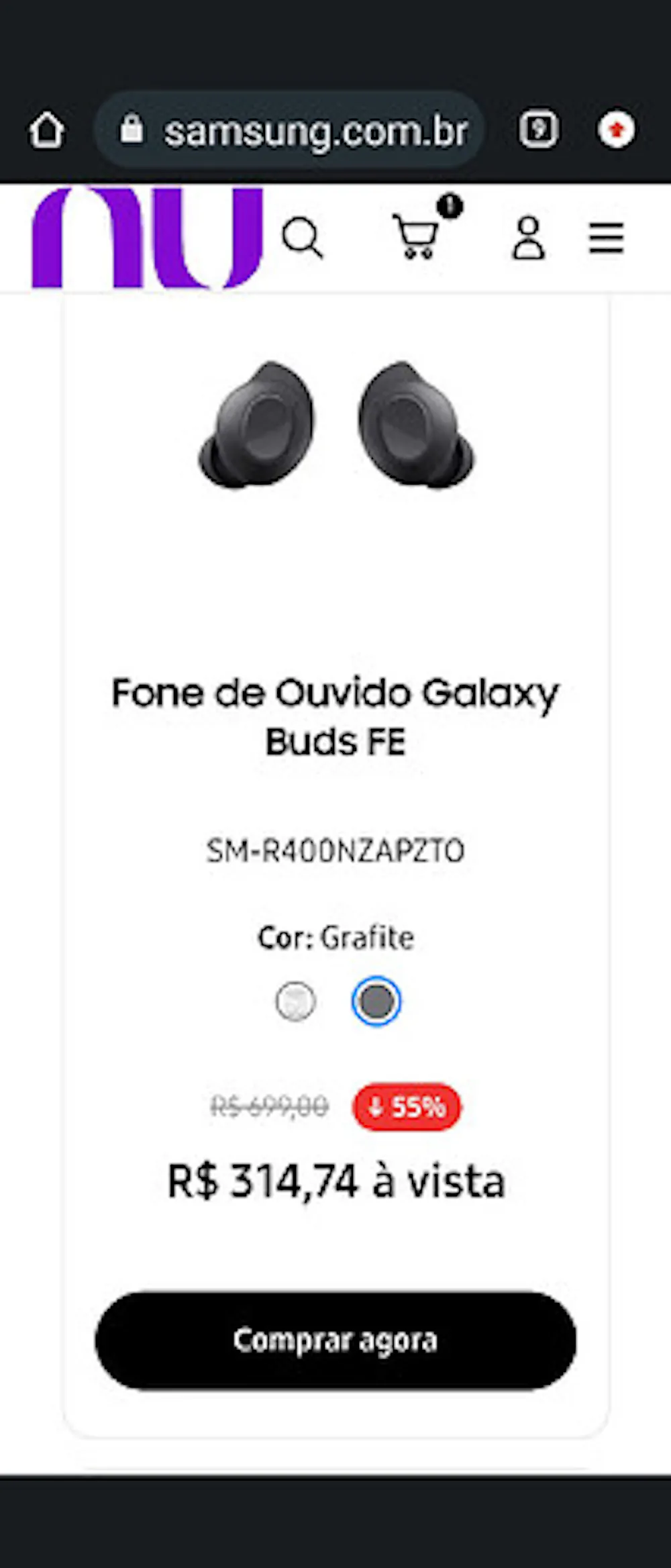 No Nu Shopping anuncia produtos Samsung com 40% de desconto. Mas está mais caro que na loja samsung.com.br No Nu Shopping: image685×1600 76.4 KB No Samsung.com.br (sem ser pelo Nu Shopping) image1479×463 32.3 KB