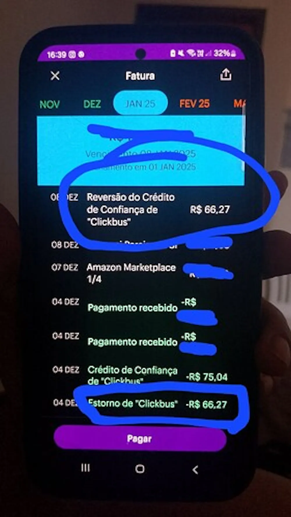 Fiz 3 compras no mesmo valor na clickbus, 3 passagens porém uma dessas compras foi duplicada, tentando resolver a situação cancelei uma delas e recebi o estorno da compra normalmente no entanto já tinha entrado em contato com a Nubank sobre isso e tinha recebido um “credito de confiança” no valor correto mas quando fui olhar a fatura percebi que houve uma reversão do credito de confiança da clickbus mas era no valor do meu reembolso.