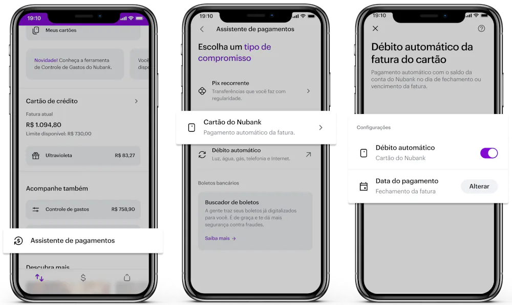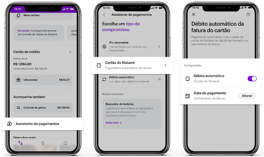 O débito automático faz parte do “Assistente de pagamentos”, a nova área do app que te ajuda no planejamento do mês e permite controlar suas contas (como boletos emitidos no seu CPF e transferências recorrentes) em um único lugar e de forma organizada.
