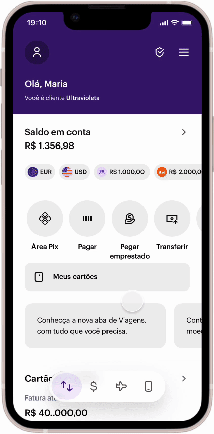 Agora, o Nu Viagens passa a ter um espaço dedicado e em destaque, pensado para que clientes Ultravioleta encontrem rapidamente tudo o que envolve sua experiência de viagem. Ali, ficam reunidos voos, hotéis, alertas de preço, suporte e outros recursos para planejar, acompanhar e aproveitar a viagem do começo ao fim.