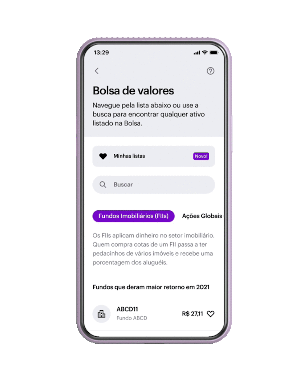 Área de Favoritos é uma função dentro do app do Nubank que permite que você possa favoritar os seus ativos, com a criação de listas personalizadas e adicionando os ativos preferidos da Bolsa de Valores. Essa funcionalidade facilita a visualização de ações/BDRs/ETFs/FIIs e ainda permite que você compare informações sobre o desempenho de cada ativo.