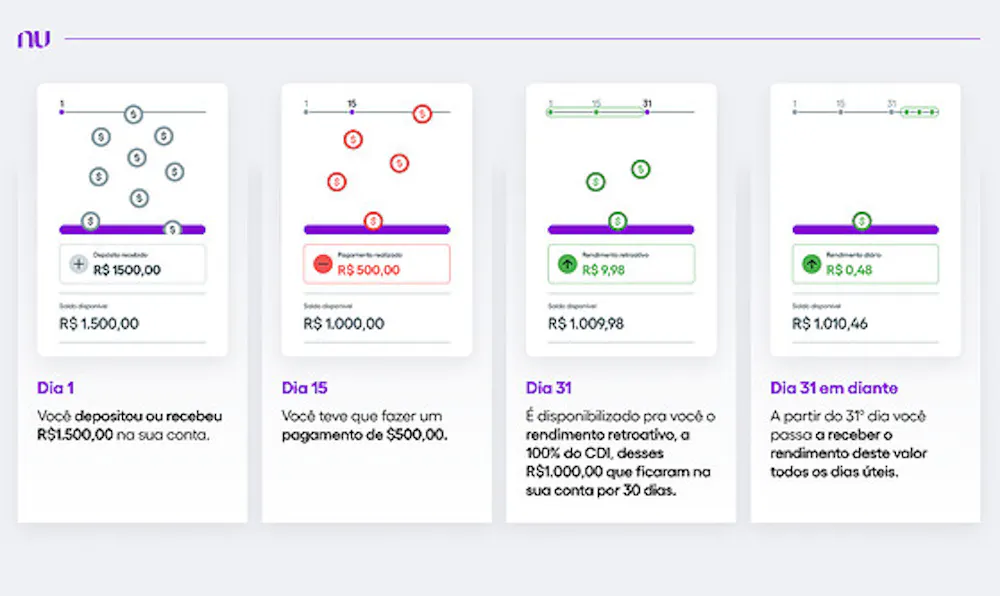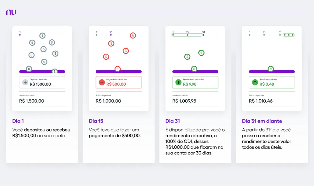 No 31º dia após o depósito, você terá à disposição o rendimento total que esse valor teve nesses 30 primeiros dias. Nós chamamos isso de rendimento retroativo, é como se o seu dinheiro estivesse rendendo desde o primeiro dia em que foi depositado.