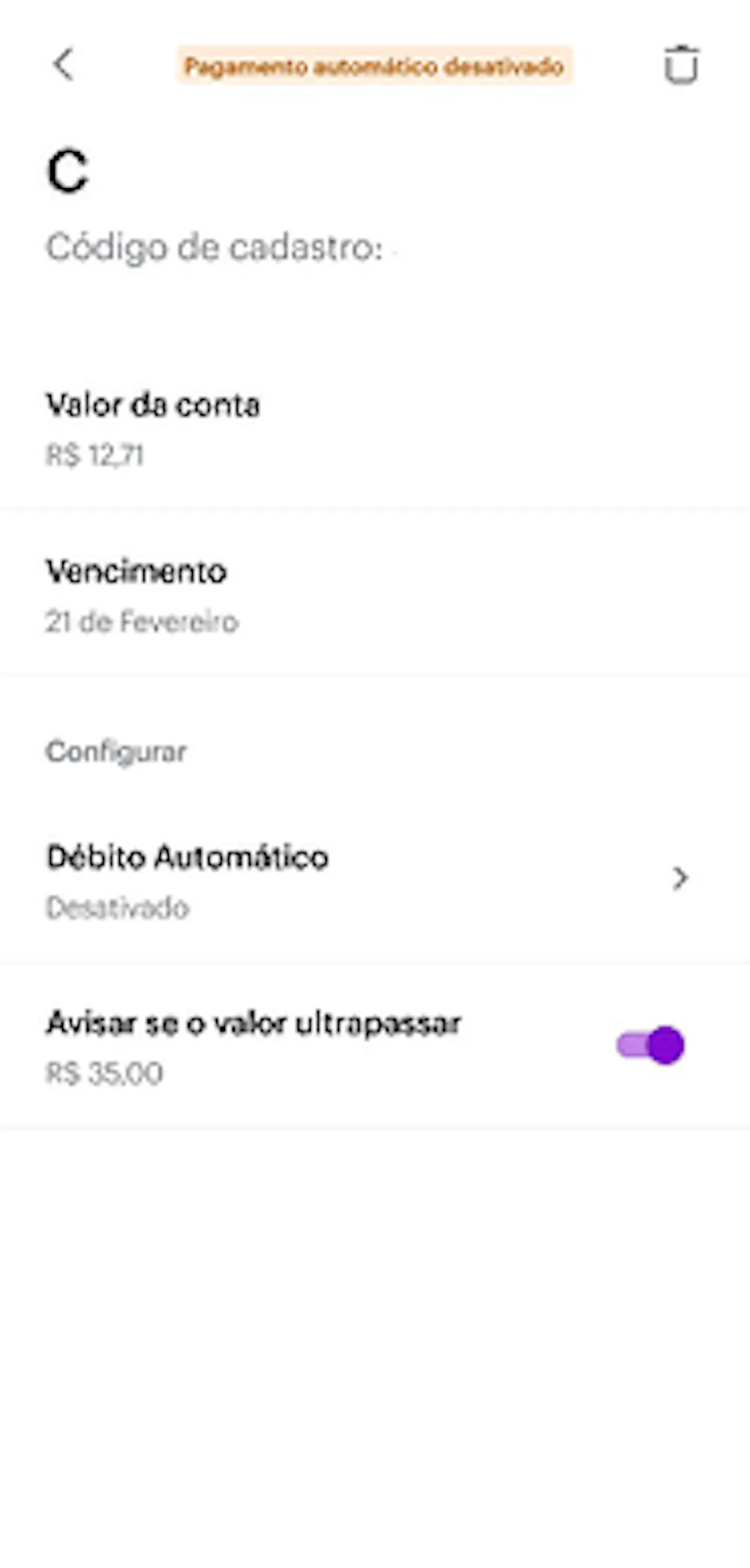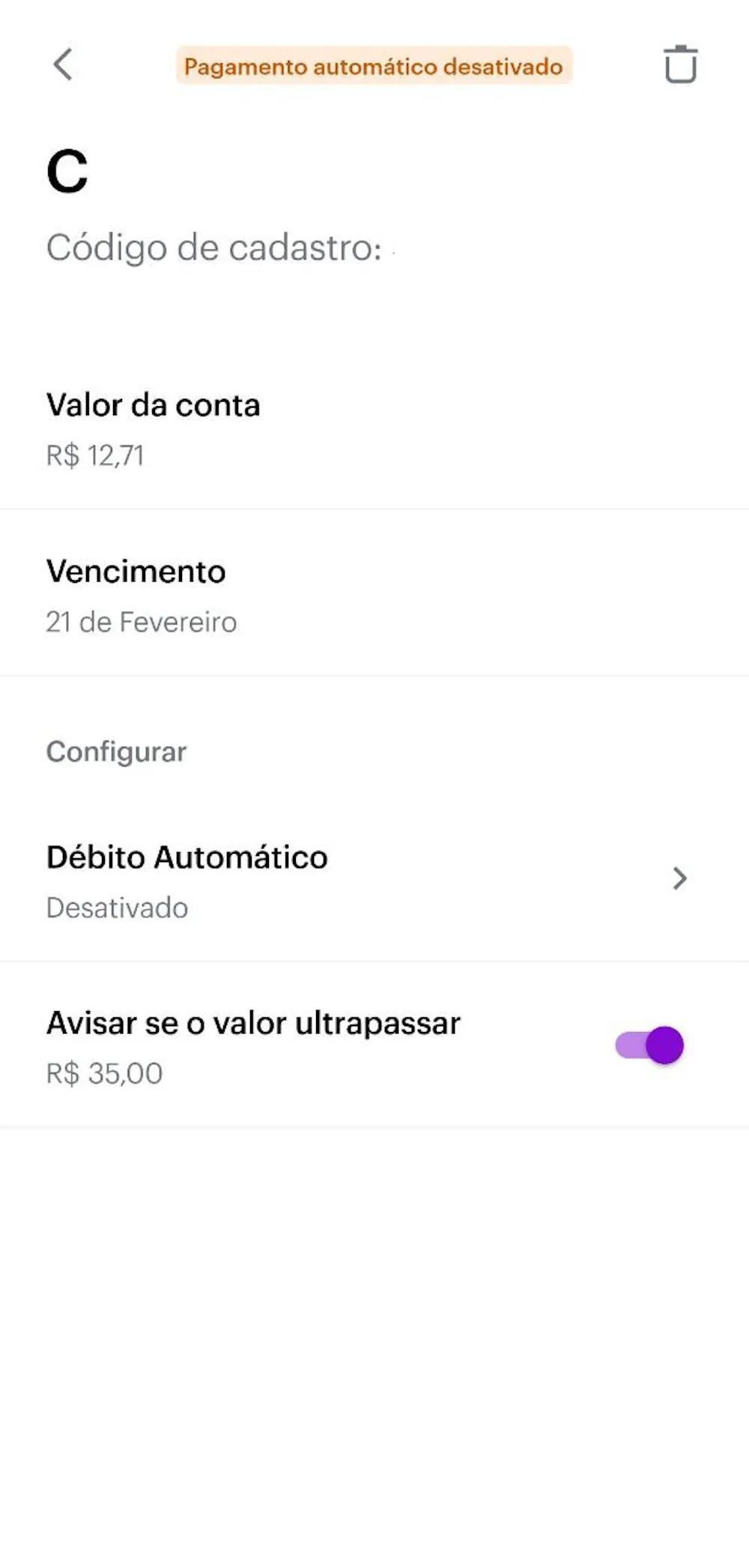 Digamos que você preferiu pagar manualmente a conta cadastrada naquele mês. Você verá a opção de configurar o pagamento e poderá apenas pausá-lo, reativando-o posteriormente quando desejar.
