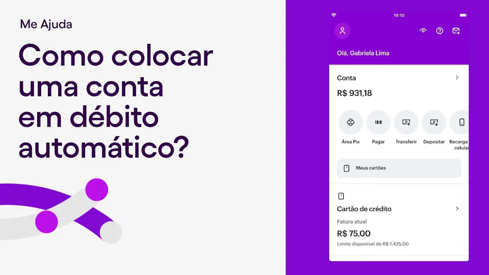 O débito automático é utilizado para cadastrar contas de consumo - como luz, água, gás, internet, telefone e tributos -, e, no dia do vencimento, o pagamento é feito para você usando o saldo disponível de sua conta do Nubank. Basta acessar a página inicial do aplicativo e descer até a área de “Descubra mais”.