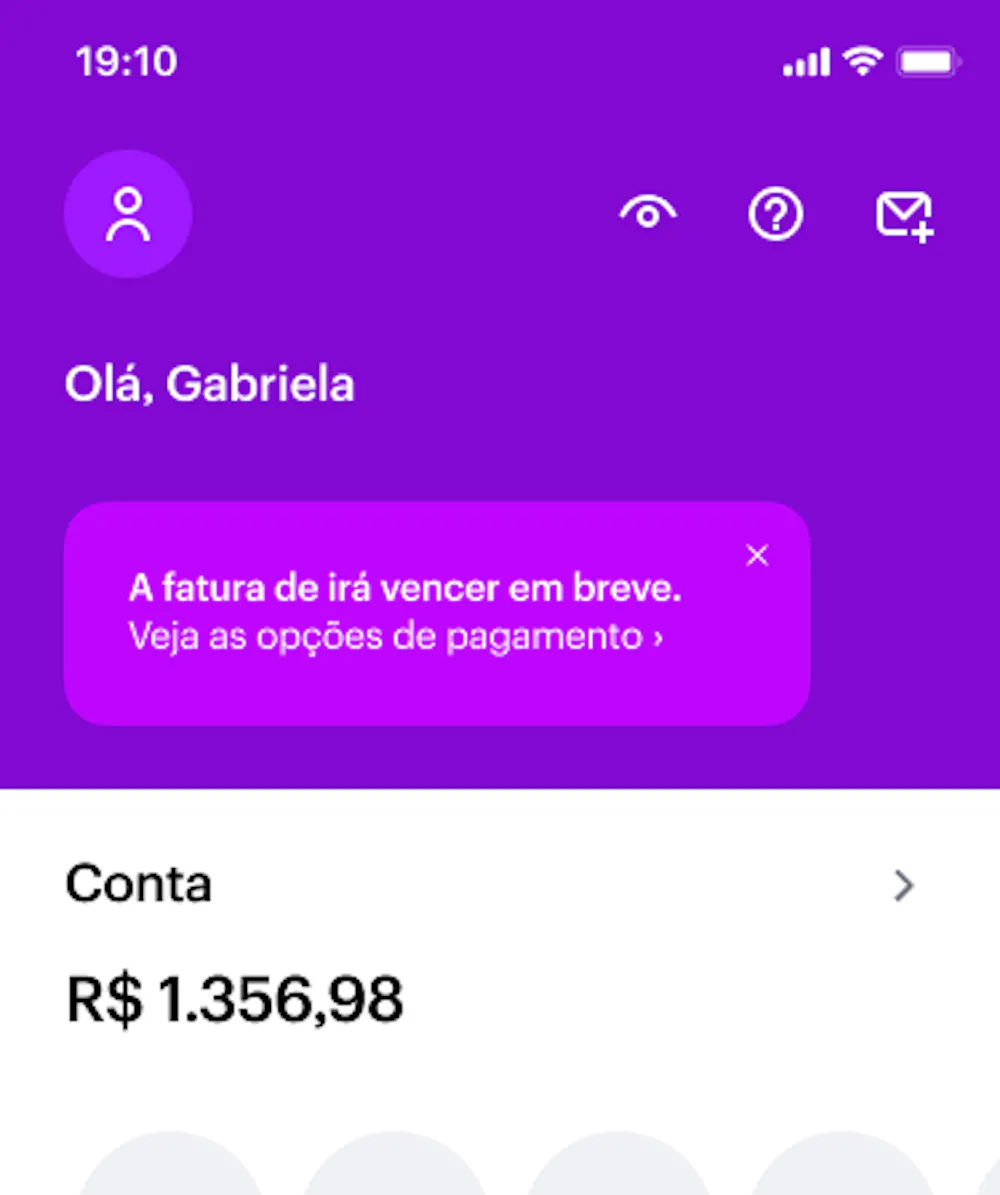 Inicialmente, a mensagem ainda será com Cartão de Crédito, mostrando o fechamento e vencimento da fatura, queremos melhorar a experiência para aqueles que usam o roxinho, tornar o app mais personalizado, fazendo com que ao abrir o aplicativo, a pessoa consiga ver o que é mais importante naquele momento.