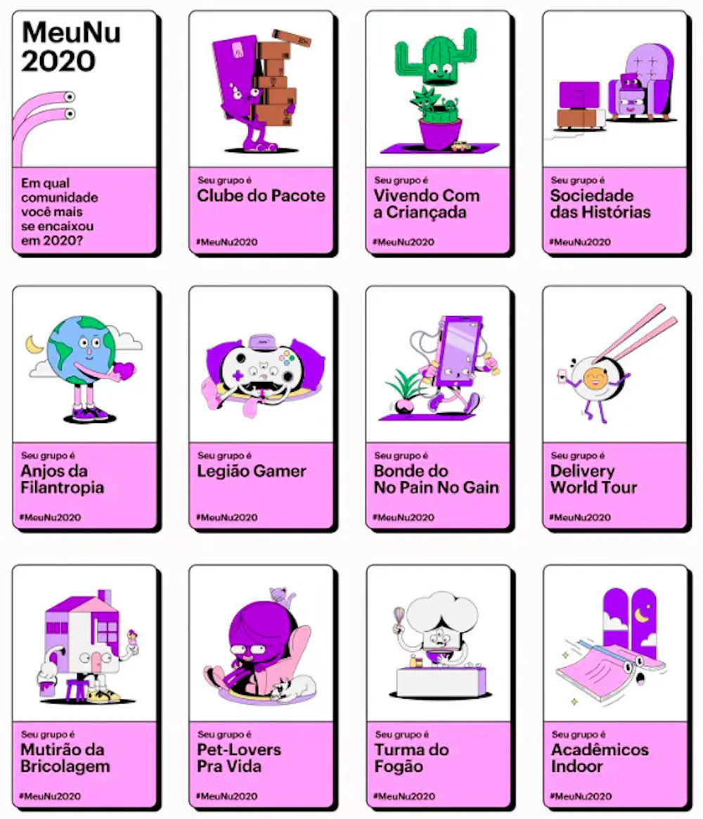 Em nosso blog mostramos os 9 grupos em que nossos clientes estão espalhados: Retrospectiva Meu Nu 2020: o que vivemos juntos, ainda que distantes - Fala, Nubank
