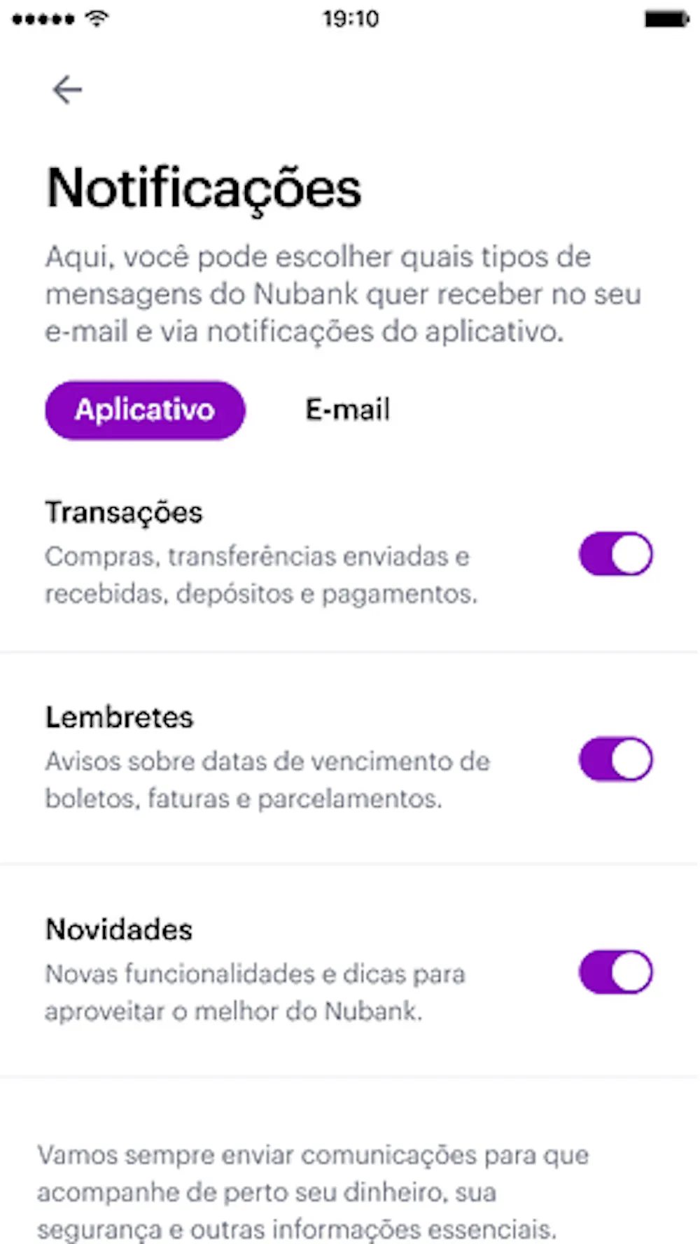 Agora, os clientes poderão escolher, diretamente pelo app, quais categorias de mensagens desejam receber do Nubank, tanto por email, quanto pelas notificações enviadas no aplicativo.