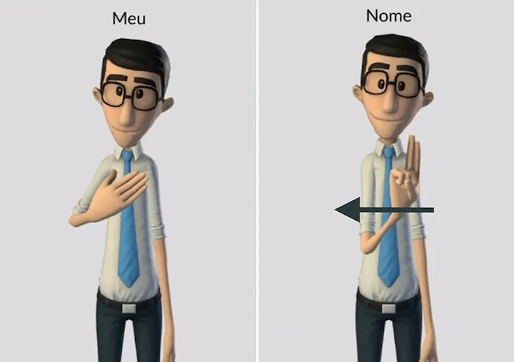 Passo 2 â Apresente-se. Agora que vocĂȘ jĂĄ viu como soletrar seu nome, o prĂłximo passo Ă© se apresentar. Para isso, uma das maneiras Ă© usar os sinais de âmeuâ e ânomeâ, como nas imagens abaixo.