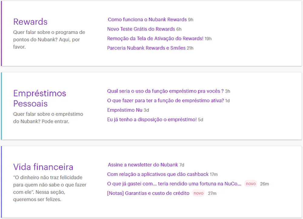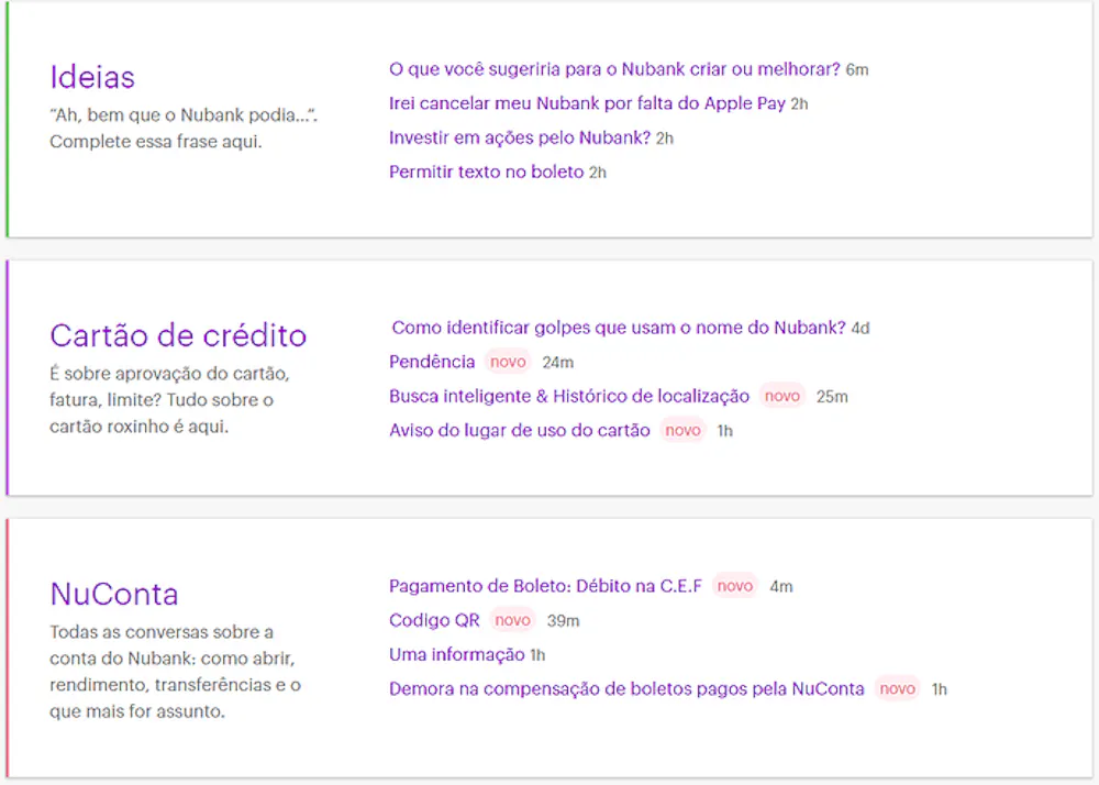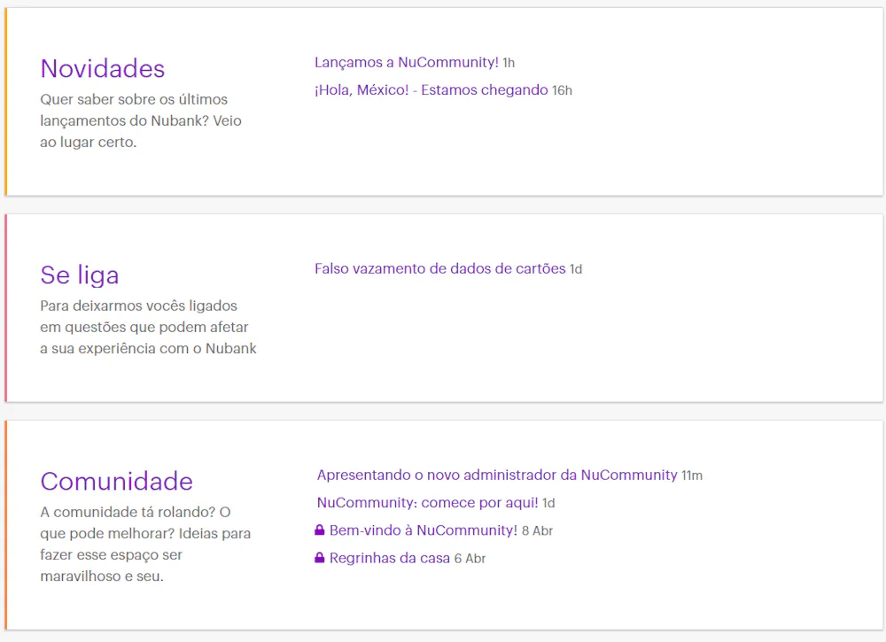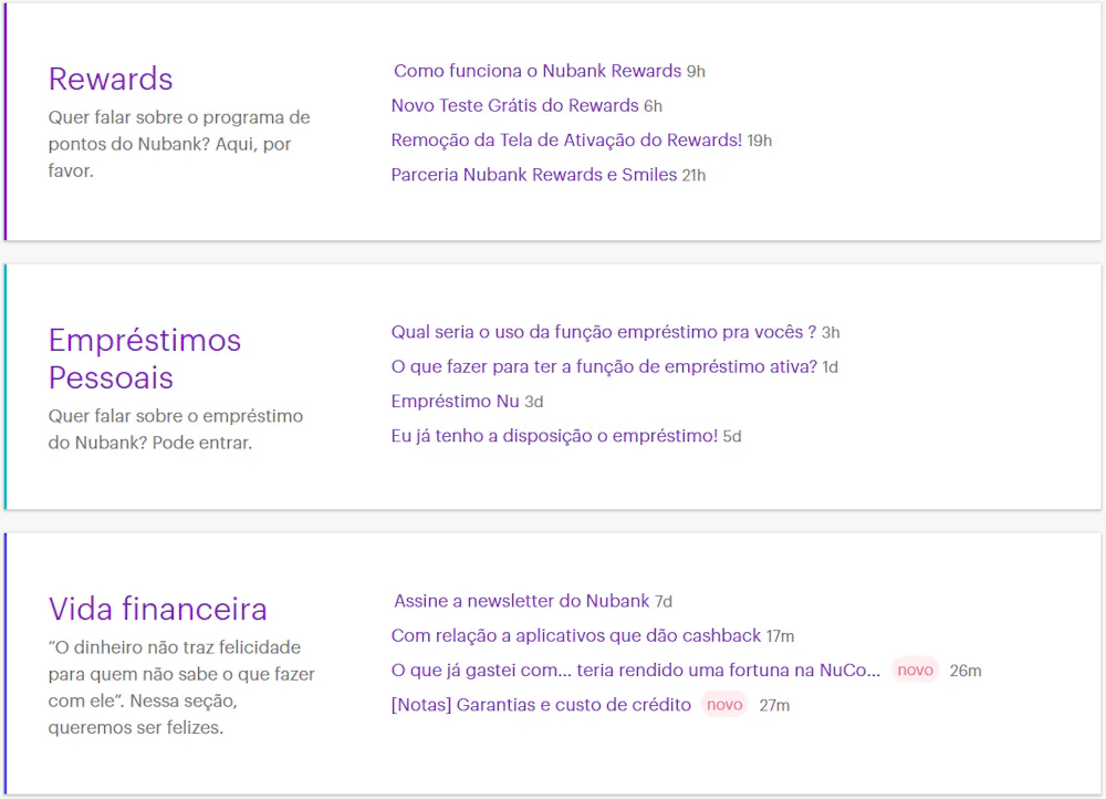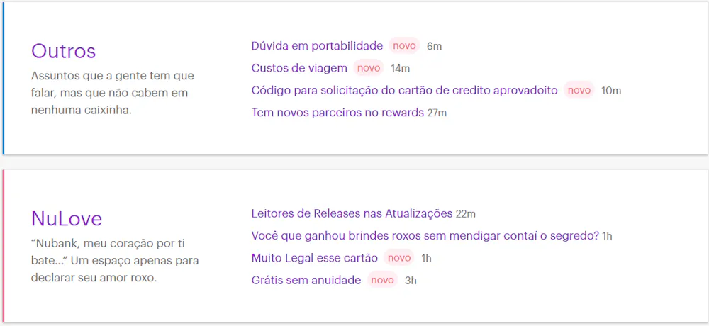 A NuCommuty é dividido em temas. Por exemplo: