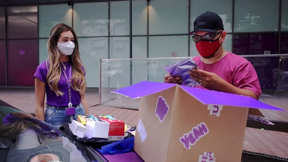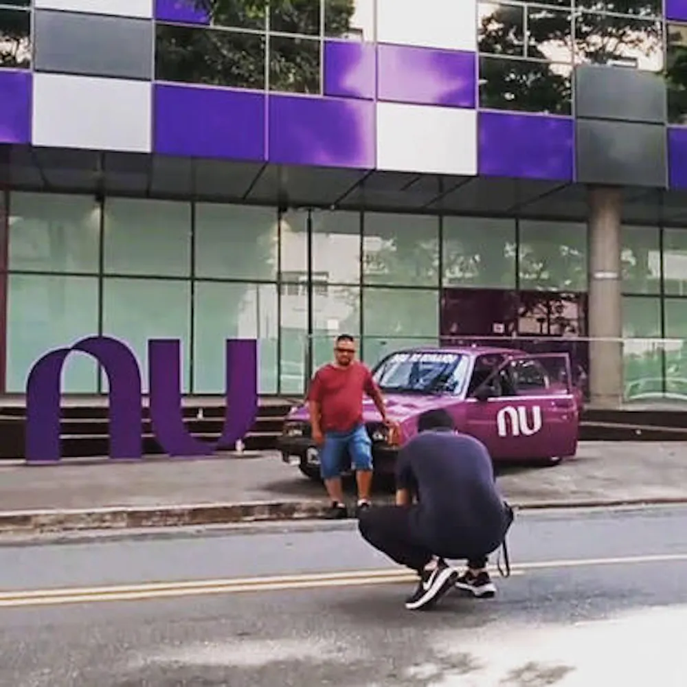 Assim, nós, do time de Audiovisual do Nu, recebemos o Jefferson no nosso escritório (todos testados e respeitando os protocolos de COVID-19), para fazer a foto que ele havia pedido e começar nossa diária de gravação. Para surpresa do Jefferson, já havíamos mobilizado os times de segurança do escritório para colocar o Chevette na calçada ao lado do logo do Nu. Fizemos inúmeras fotos dele com o carro e com a família, quando a @SooL , uma de nossas Xpeers, apareceu com a caixa cheia de Wows, decorada com adesivos do Nubank e a entregou para ele como um presente de agradecimento pela homenagem, e também como uma espécie de ajudinha da nossa parte para a realização desse sonho.