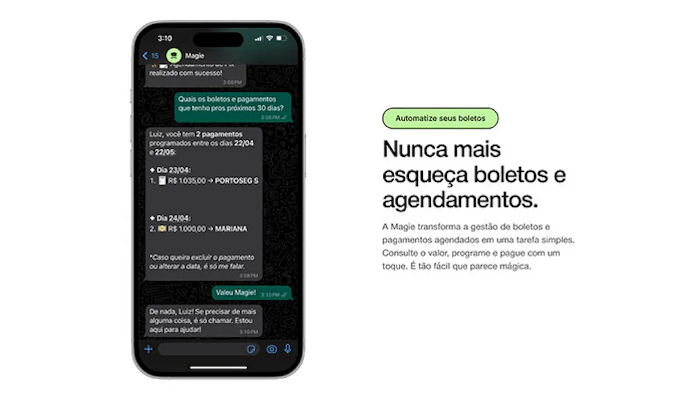 Isso mesmo, a Magie é uma fintech pioneira nesse nicho. O primeiro banco que opera unicamente dentro do mensageiro mais popular do mundo. Ou seja, dispensa a instalação de qualquer aplicativo no seu aparelho, ocupando espaço e armazenamento e consumindo sua preciosa memória RAM.