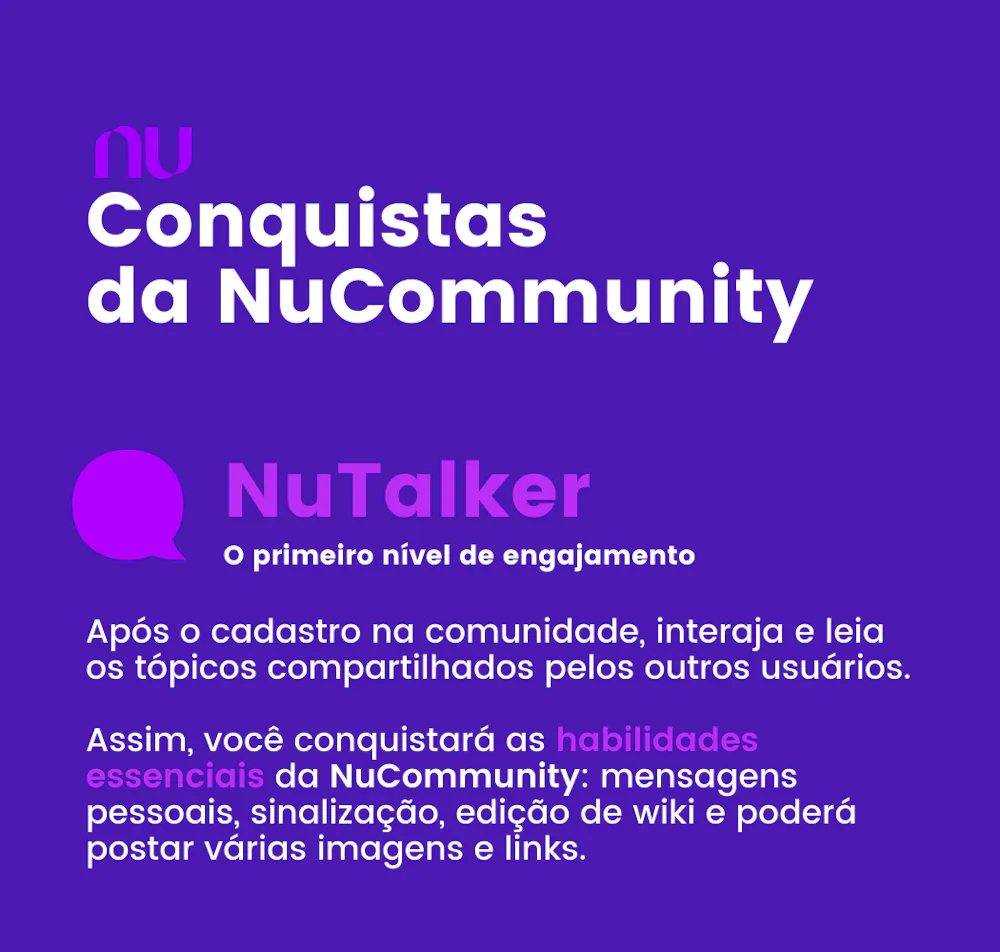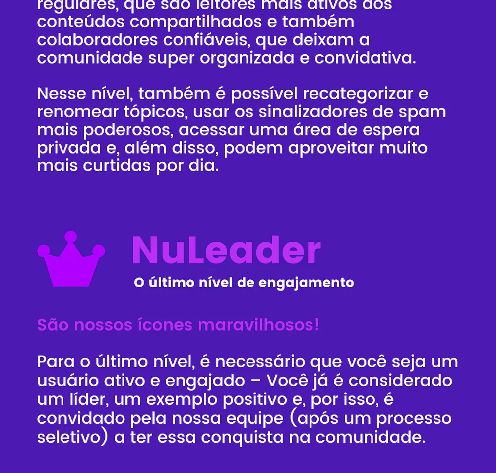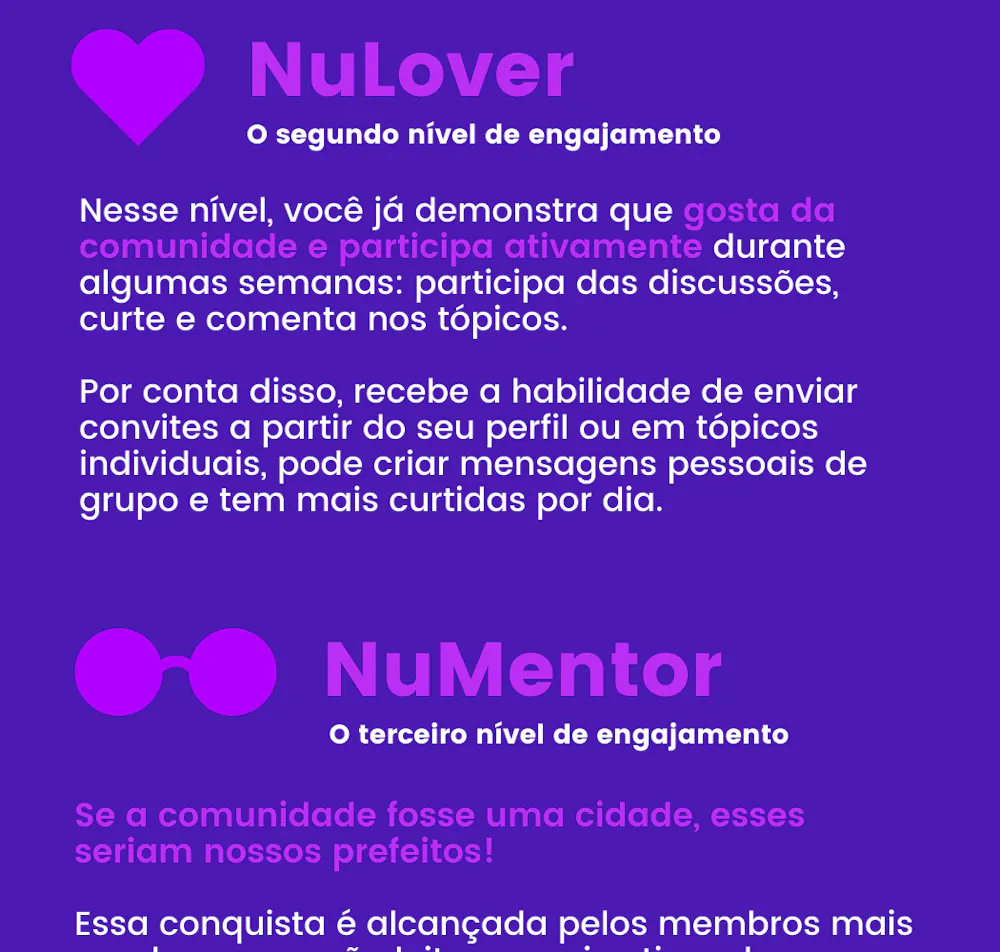 Além disso, temos alguns níveis de engajamento que demonstram o quanto você participa das nossas discussões e compartilha a sua opinião – Nesse momento, temos 4 níveis: NuTalker, NuLover, NuMentor e NuLeader. Vamos ver como funciona!