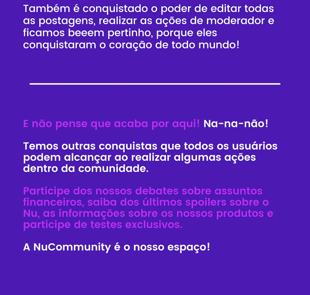 A comunidade é um espaço aberto a todos que gostam do Nubank e que têm interesse em discussões sobre o mundo financeiro. Mas também é um espaço para conhecermos mais sobre o dia a dia dos nubankers, conhecer mais sobre os produtos e últimos lançamentos e o mais importante: saber que existem vários usuários que compartilham o mesmo carinho por esse universo roxo.