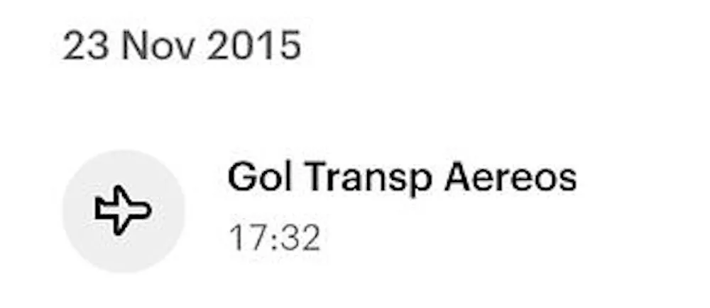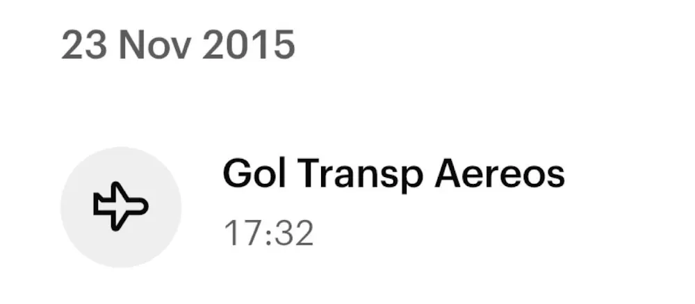 E aí fiquei curioso pra saber qual foi a minha primeira compra com o roxinho. No app, acessei o histórico do cartão de crédito e tive que ir descendo até encontrar. E minha primeira compra foi uma passagem de avião para passar as férias com a família.