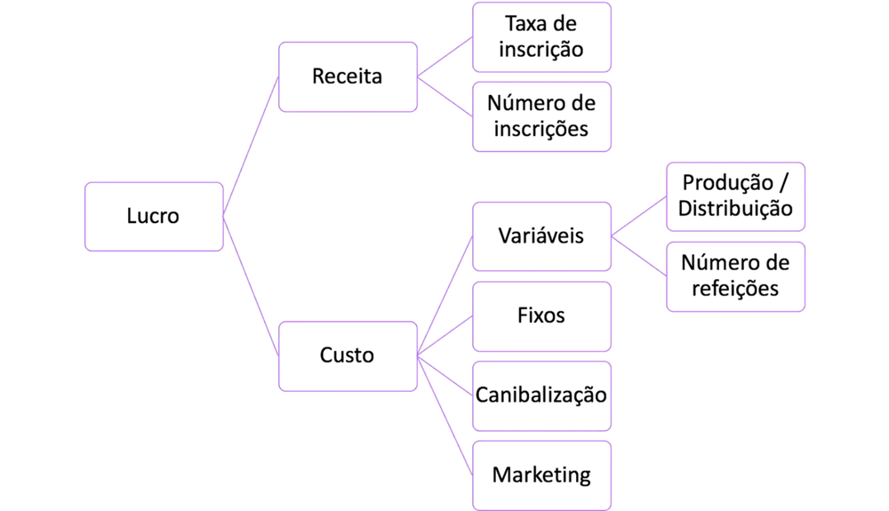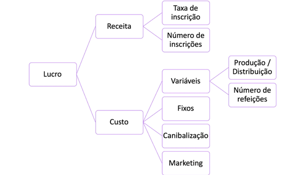 É importante que o candidato pergunte pelos dados levantados no framework da questão anterior. Podemos fornecer uma tabela ou apenas citar alguns dos números do case – como o custo fixo, o valor da assinatura, o custo de produção e distribuição de cada refeição.