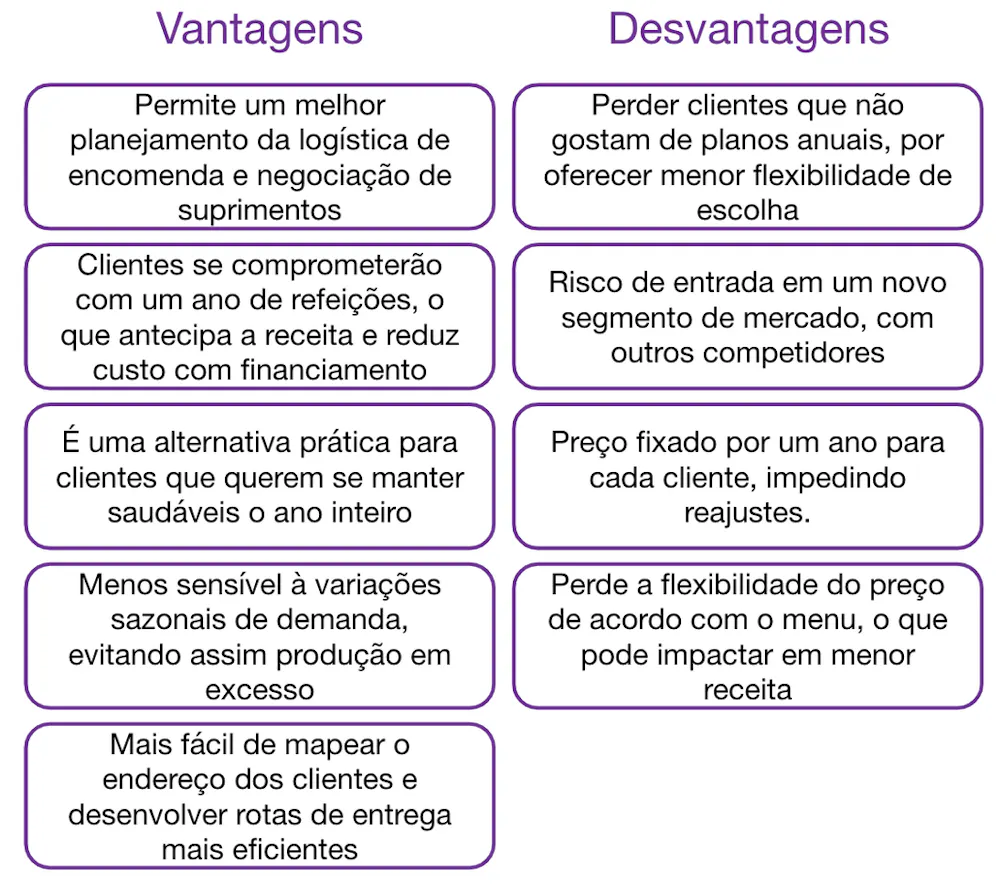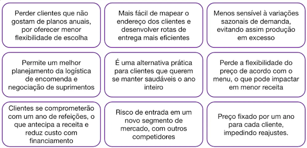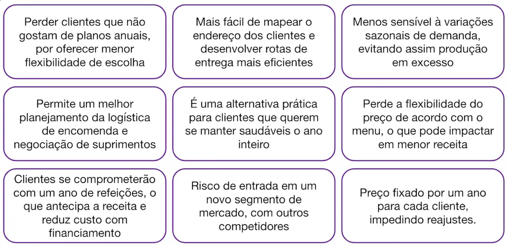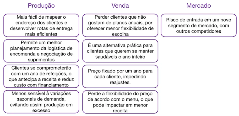 “Case: você é manager em uma startup que vende comida saudável por delivery online. Hoje, você vende porções individualmente. A sua estratégia não está funcionando tão bem e vocês estão perdendo dinheiro. Você está considerando oferecer um serviço de assinatura onde os clientes pagariam anualmente e receberiam várias porções ao longo de todo ano.”