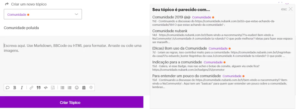 Temos uma ferramenta ao lado da criação que mostra se tem tópico parecido ou igual, neste mesmo que escrevo tem alguns parecidos como a imagem abaixo.