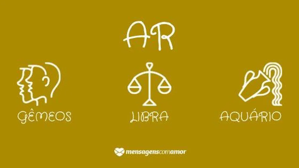Os signos de ar são: gêmeos, libra e aquário. Algumas das características desses signos são: pessoas amigáveis, pensadoras, comunicativas e analíticas. São pessoas animadas e comunicativas, eles tem a mente aberta e são muito espertos.