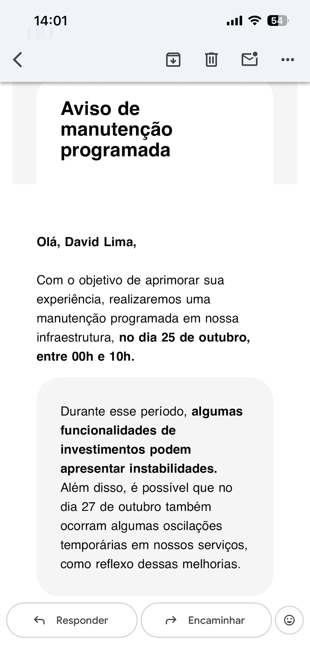 Estou com uma dúvida referente a manutenção que está havendo na parte de investimentos isso não impacta em nada além dos investimentos não né? Recebi um e-mail referente a essa manutenção. IMG_11901170×2532 215 KB