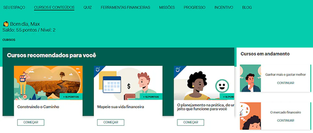 Os cursos são ideais para quem quer colocar as contas em dia ou está começando a investir. As aulas são rápidas e dinâmicas. Os cursos são categorizados e podem ser concluídos em pouco tempo. O sistema de gamificação dá um incentivo a mais para o aprendizado. Resumindo, é uma ótima opção de educação financeira com cursos rápidos e gratuitos.