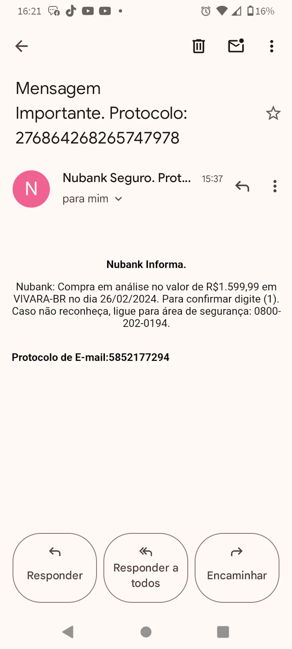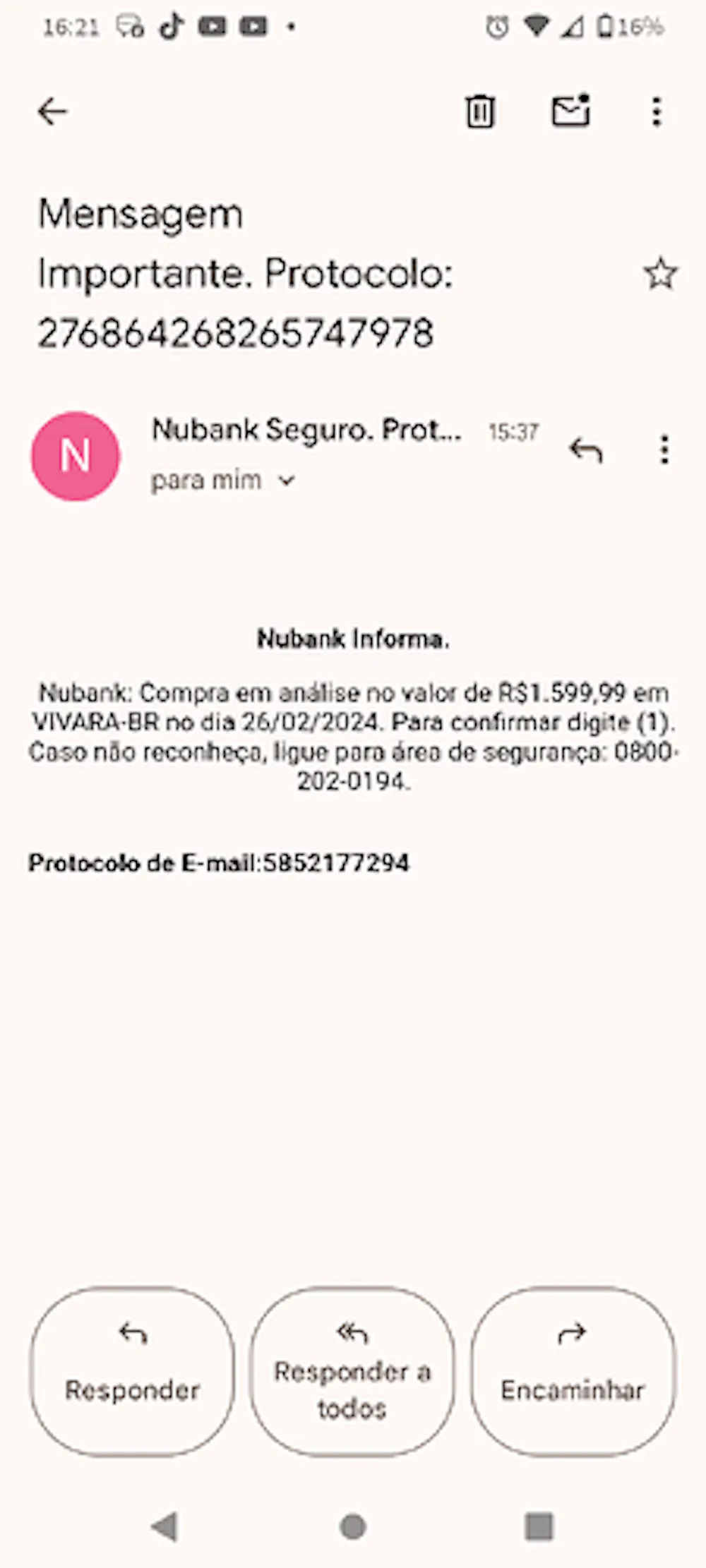 Screenshot_20240226-162116720×1600 67.8 KB Recebi esse e-mail, entrei em contato no chat da nubank e me disseram que não provém do sistema deles.