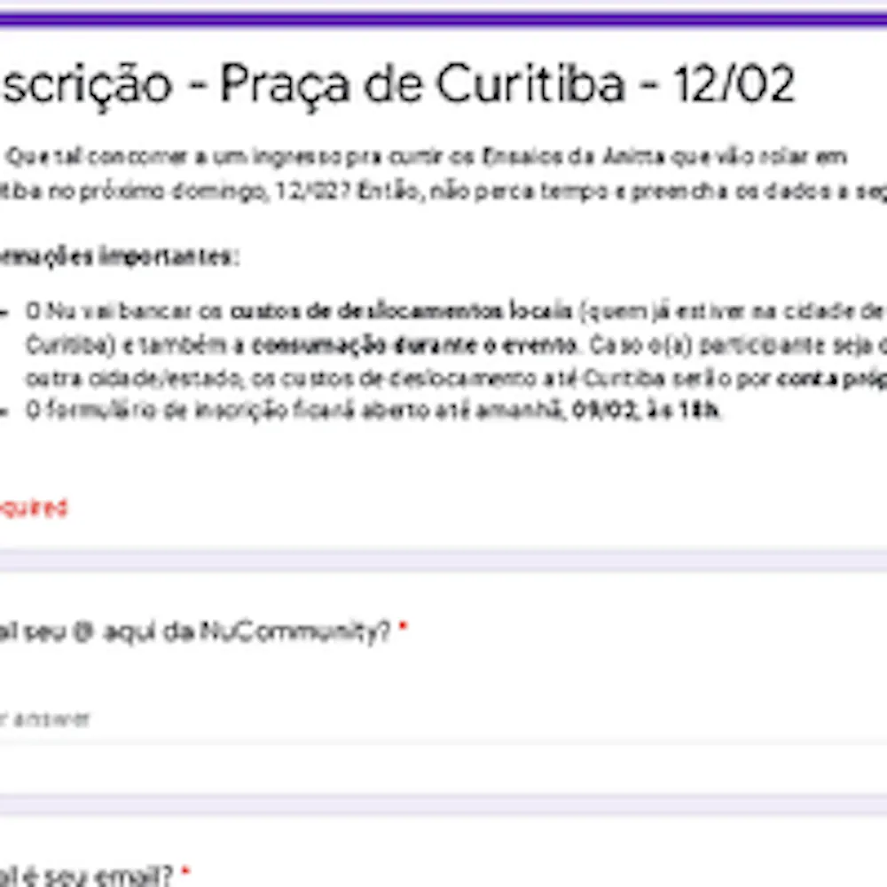 Aliás, aproveitando o clima, que tal ter a chance de faturar um ingresso para o Ensaio da Patroa que vai rolar em Curitiba nesse próximo domingo, dia 12/02? Então, não perde tempo e corre pra preencher este formulário, que o Nu vai selecionar 3 membros da NuCommunity para curtir muito esse próximo evento