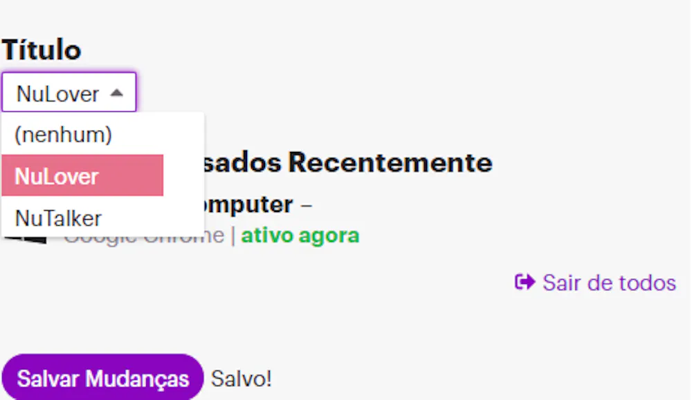 Bom pessoal, não sei se é apenas comigo que está acontecendo esse erro, mas toda vez que tento mudar o título de NuTalker para NuLover, ele salva mas quando saio que entro na comunidade novamente, ele volta a marcação ficando (nenhum ou NuTalker) se alguém souber algo a respeito e quiser ajudar ficarei grato.