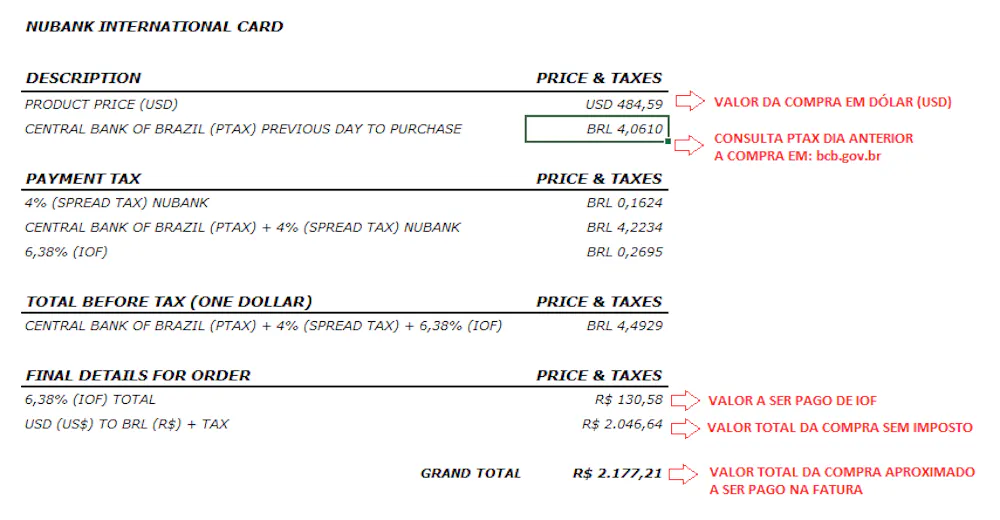 Criei uma planilha para realizar compras em dólar (USD) com o nosso roxinho… A mesma possui uma margem de erro de pouquíssimos algarismos devido a números a serem arredondados, segue imagem abaixo: