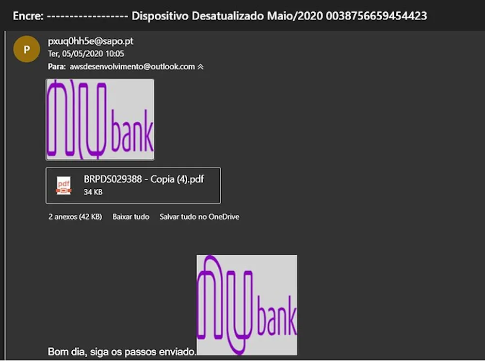 Nessa mensagem tem um simbolo fajuto do Nubank e um anexo em pdf.