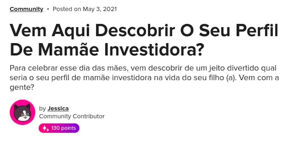 Oie, pessoal! Dando continuidade à celebração da Semana das Mães, trouxemos um quizz super descontraído para você descobrir qual é o seu perfil de mamãe investidora!