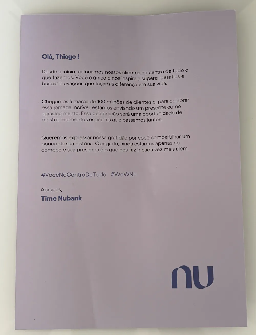 Receber esse mimo é uma prova do carinho e reconhecimento que o Nubank tem com seus clientes, e eu sinto que faço parte de algo realmente especial.