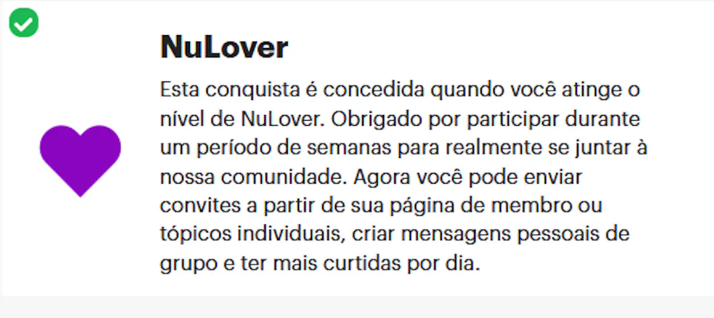 Ola familia Nubank , finalmente ganhei minha conquista NuLover , estou feliz por ter pogredido aqui no forum e ter interagido e auxiliados muitos aqui .