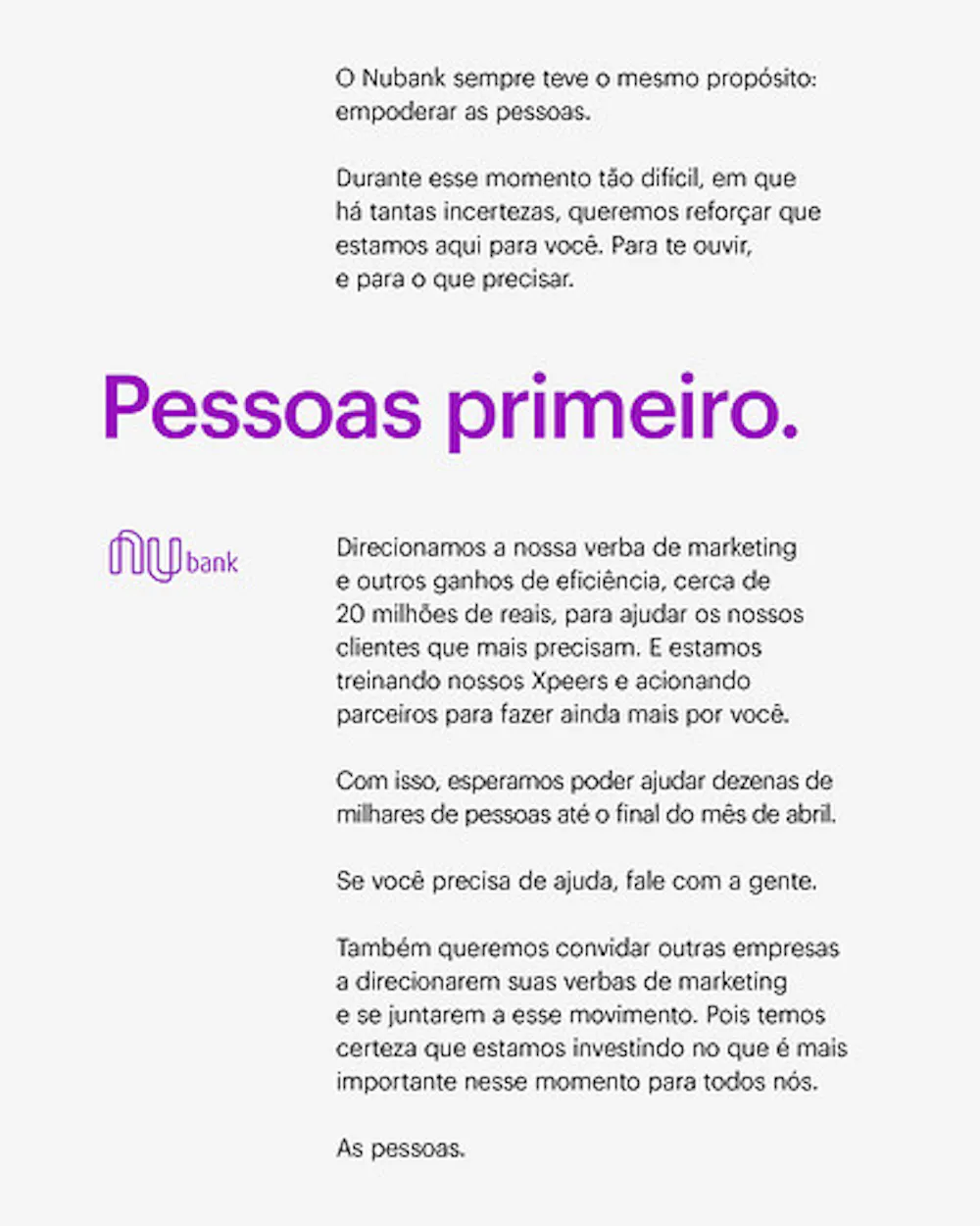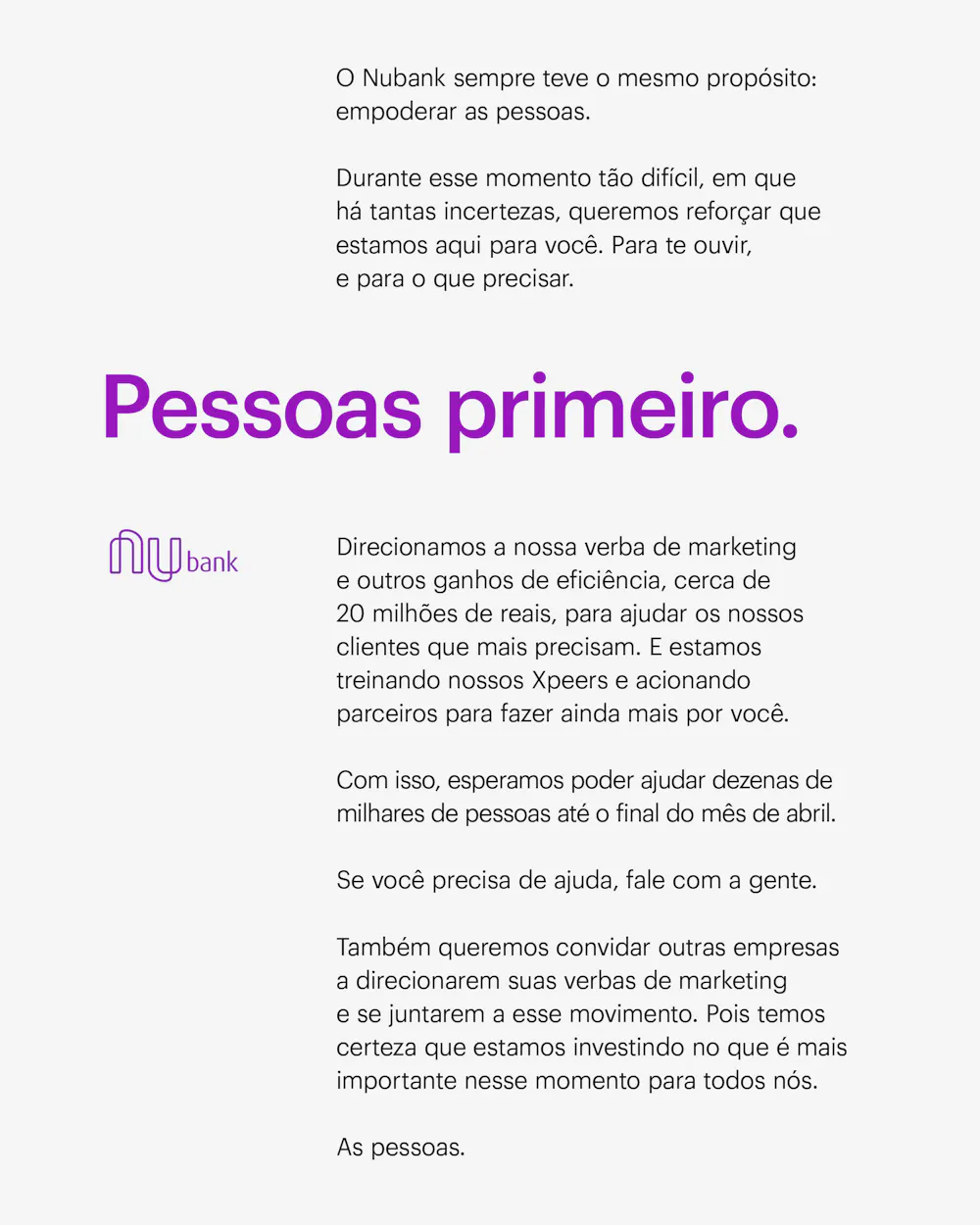 Em nome do Nubank, compartilho com vocês a carta movimento que anunciamos hoje, 24 de março de 2020: