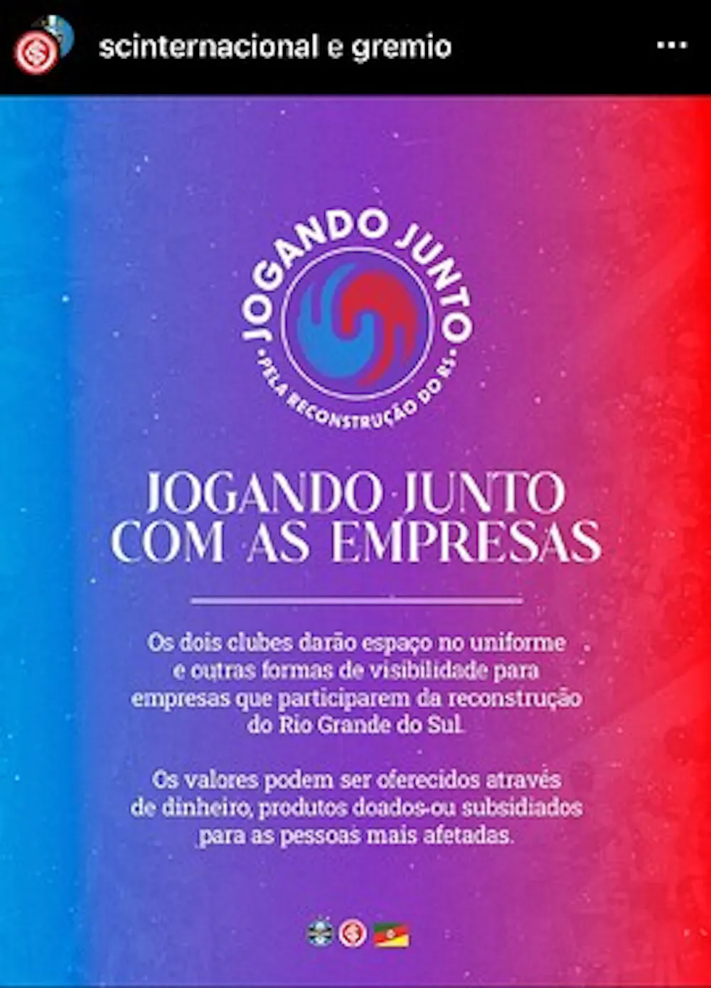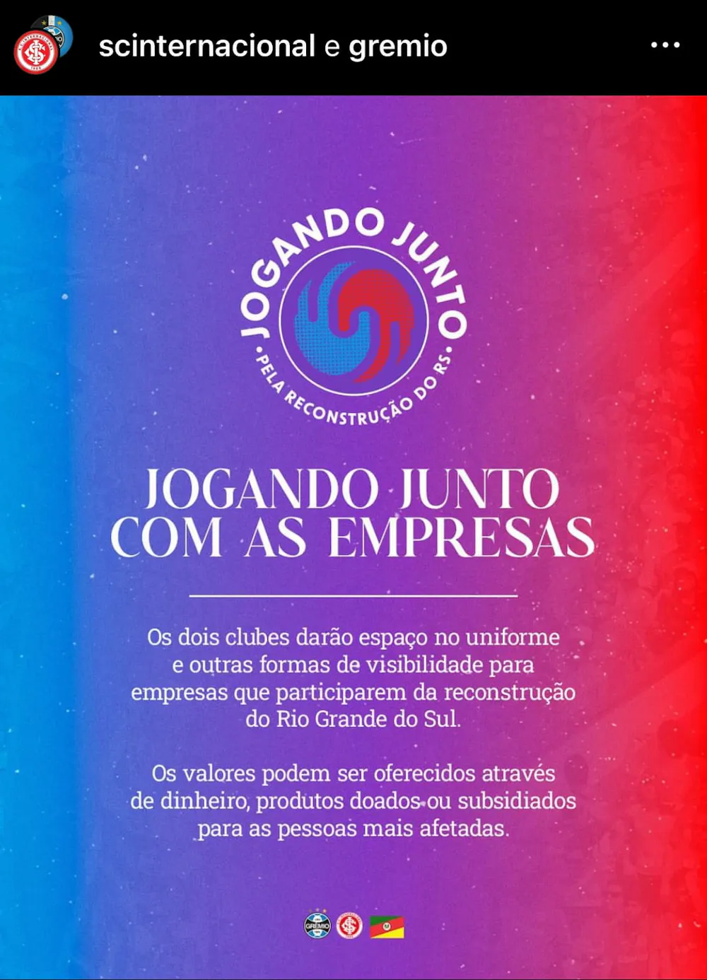 Um momento histórico para o Rio Grande do Sul e para o futebol gaúcho. Diante da tragédia que assolou o RS, a dupla Gre-Nal se uniu para apresentar a campanha Jogando Junto – Pela Reconstrução do RS, com o objetivo de estimular doações para o processo de reestruturação do nosso estado.
