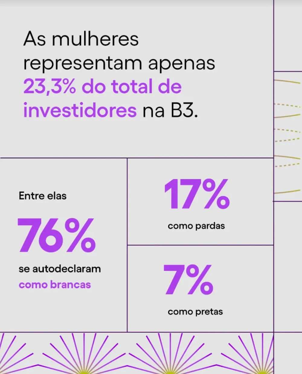 Nossa intenção foi investigar o perfil da investidora brasileira e tentar entender o que afasta as mulheres desse universo. Vocês sabiam que elas representam apenas 23,3% do total de investidoras ativas na B3? Homens ainda são maioria quando falamos de investimentos e nós aqui no Nu estávamos muito curiosos para saber por que isso acontece. Algumas dessas respostas estão presentes lá no material que criamos.