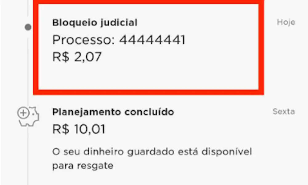 Caso você receba um bloqueio judicial, essa informação estará na linha do tempo da sua conta. Nesse caso em específico, pelo atendimento do Nubank não será possível o desbloqueio.