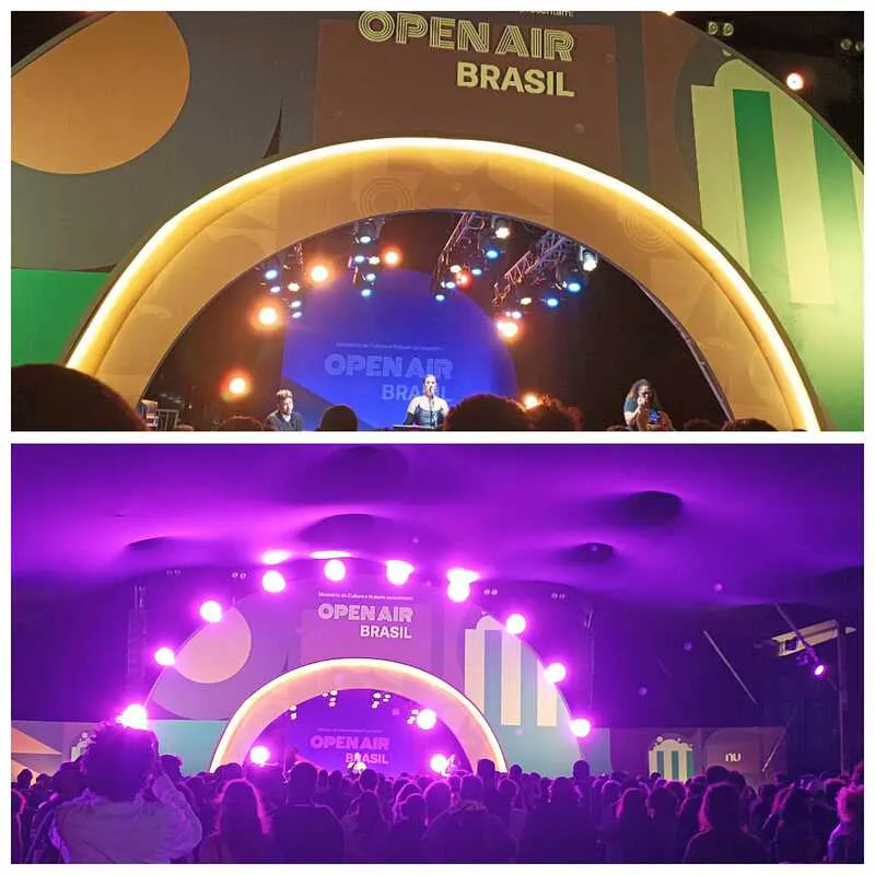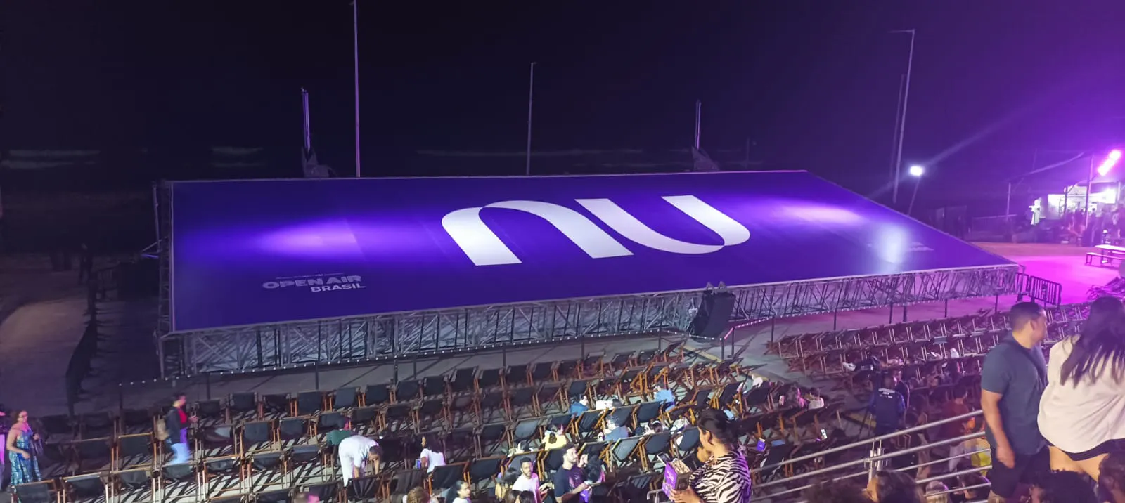 Antes da exibição, a super tela fica deitada no solo com uma leve inclinação, refletindo a logo do NU. Teve um atraso clássico de meia hora, fora o tempo que demora para colocar a tela em posição, mas que faz parte do show!