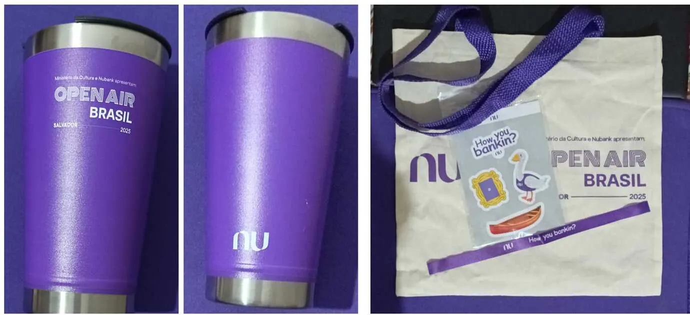 Composto por uma ecobag pequena com alças na cor roxa; uma cartela de adesivos e uma fita salva-celular/migs, inspirados na parceria do Nu com a série Friends; um copo térmico também roxo, idêntico ao que foi distribuído ano passado nos kits da campanha Planos no Papel com o Leslie e NU, 👇 só muda que tem a logo do Open Air .Brasil.