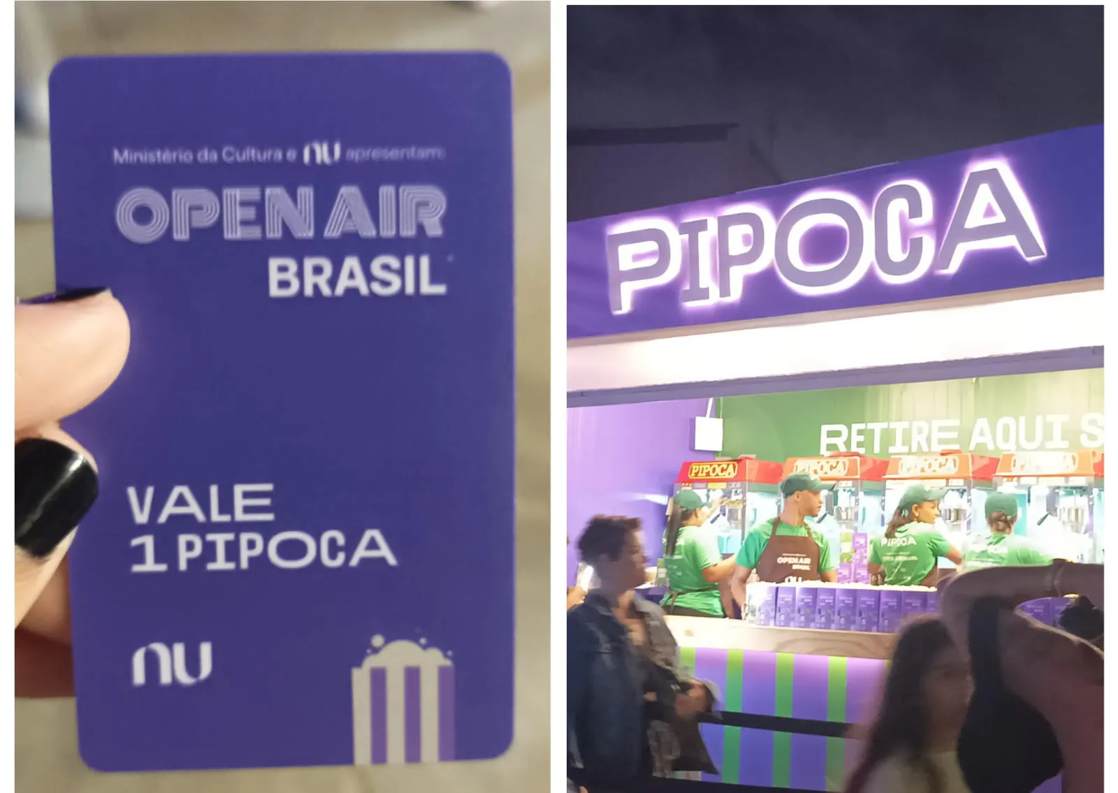 Logo na entrada, recebemos um vale-pipoca no estilo cartão na cor roxa, fazendo alusão ao cartão do Nu (vontade de levar como recordação!). 🙈