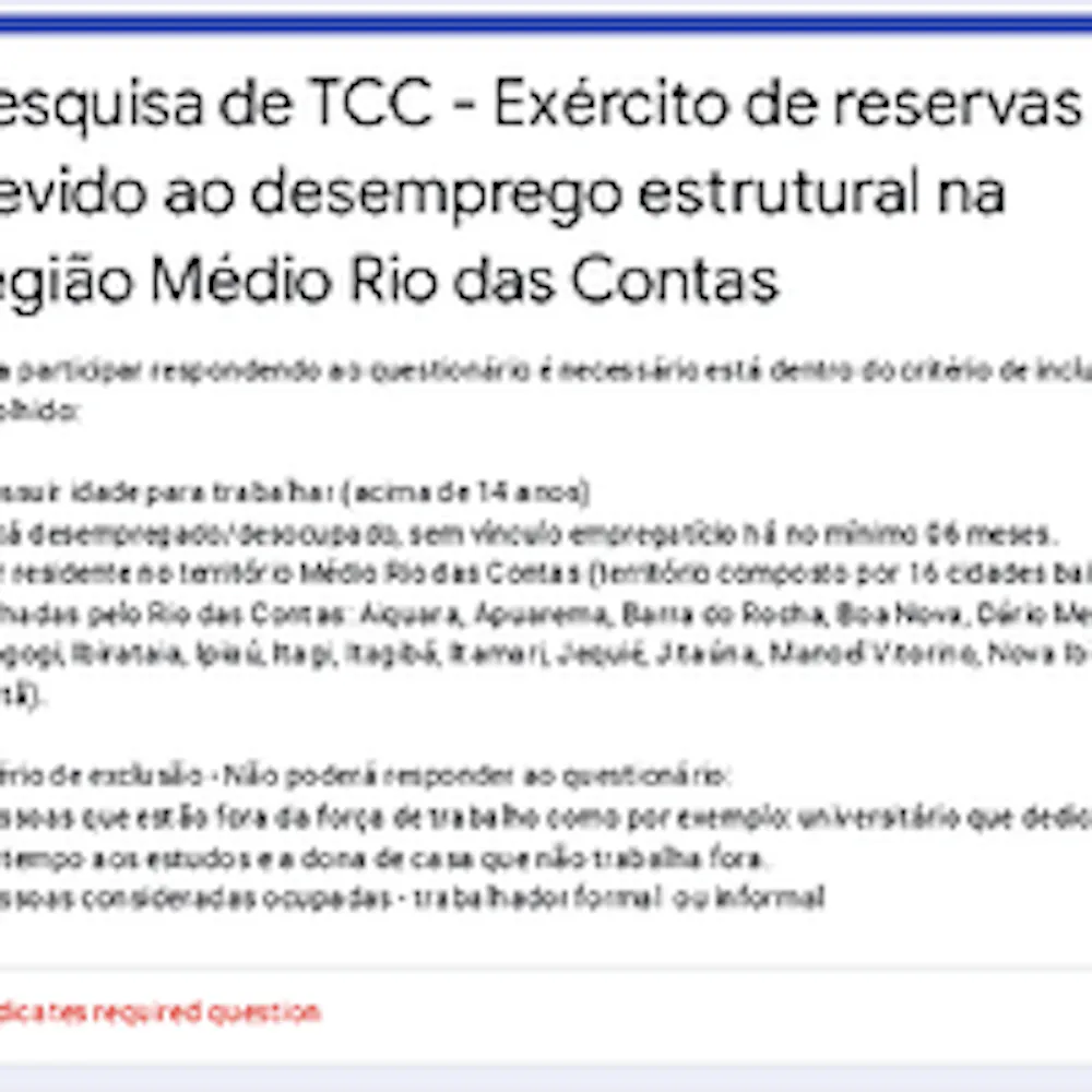 Estou fazendo o meu TCC. Objetivo da pesquisa é analisar o mercado de trabalho na percepção dos desempregados da região Médio Rio das Contas. Convido você para participar. Clique no link para responder ao questionário online. Sua participação é anônima.