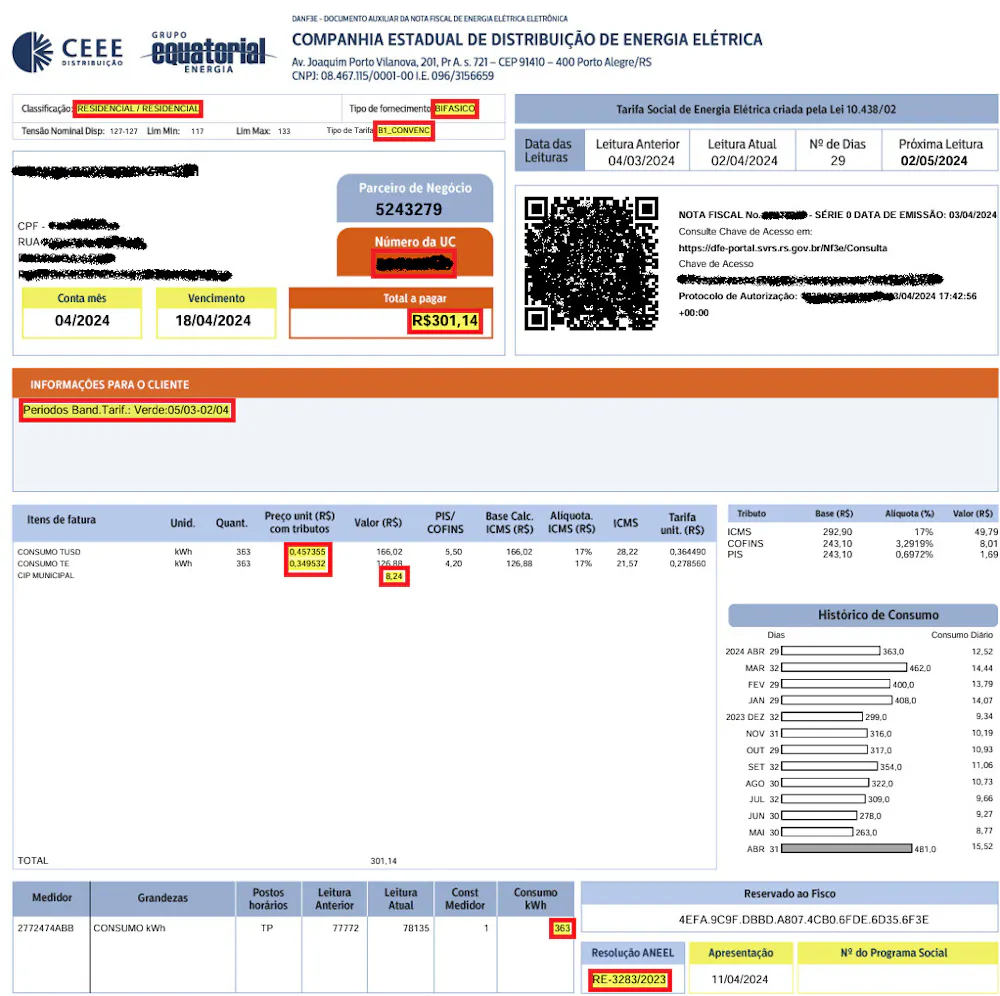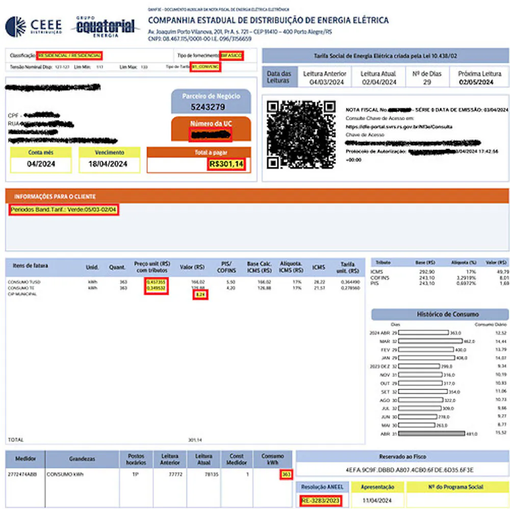 Abaixo um exemplo de fatura de energia elétrica com as principais informações destacadas: