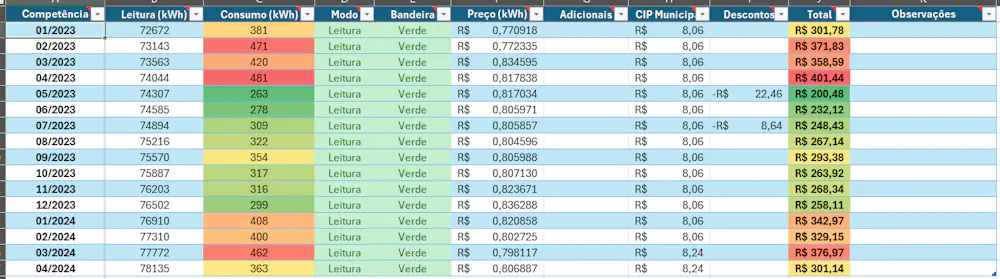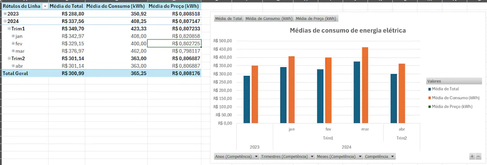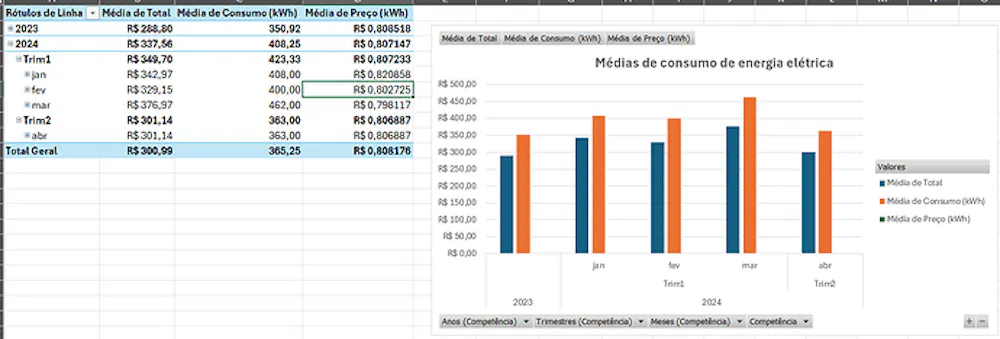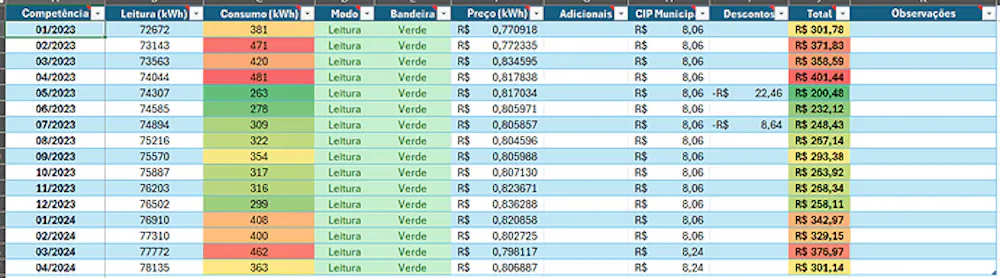 Portanto, uma dica valiosa é sempre comparar o consumo do período atual com períodos anteriores. Portanto, se estamos em abril/2024, que tal comparar o que foi gasto em abril/2023? Só não podemos esquecer que os valores podem sofrer influência de correção monetária, que ocorre geralmente uma vez por ano. Esta é a lógica do nosso trabalho.