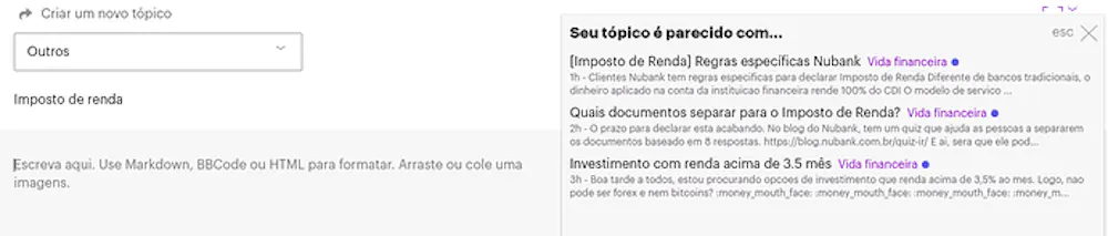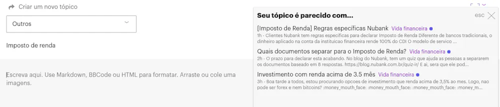 Caso a busca não mostre nada, quando você estiver criando seu novo tópico, você verá uma dica ao lado da caixa de texto informando os tópicos semelhantes ao que você está criando.