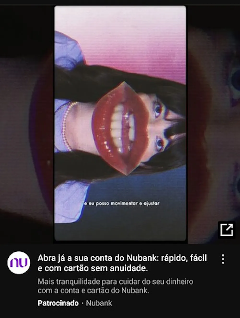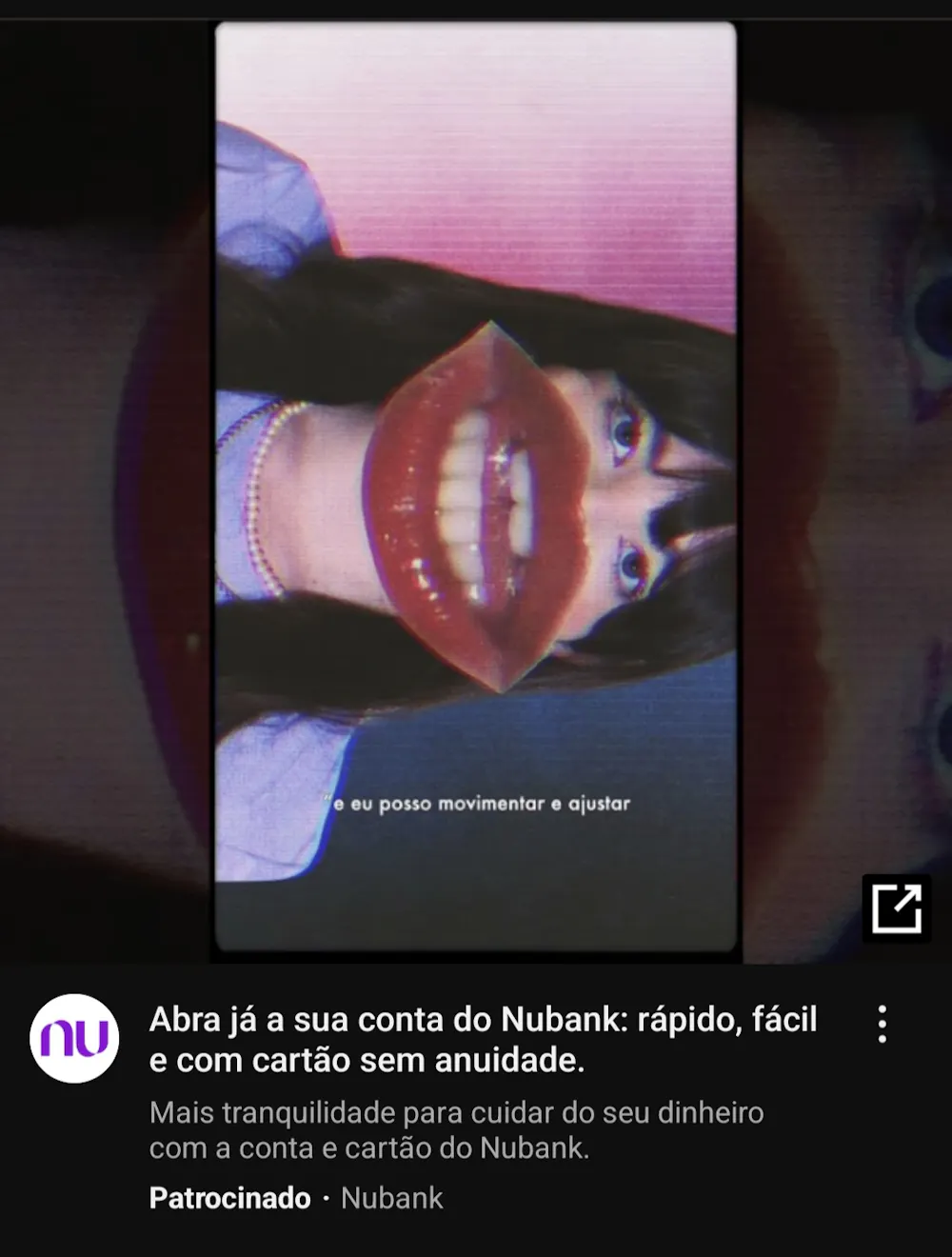 Olá, comunidade NC! Já tem um bom tempo que não abro um tópico por aqui, no entanto, depois, de ver essa publicidade do Nubank no YouTube, não resisti a tentação em compartilhar… Screenshot_20241004_181249_YouTube1080×1426 218 KB Achei estranho! Kkkk Alguém já tinha visto? E aí, gostou?