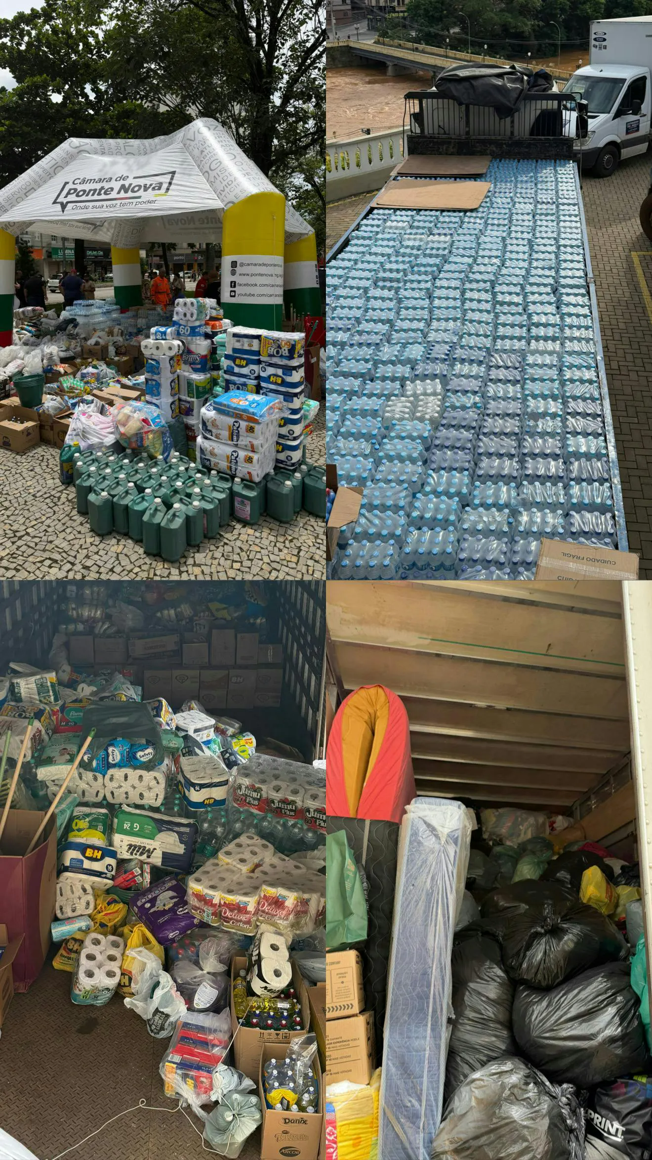 Arrecadamos alimentos, ração animal, material de limpeza, roupas, colchões e muito mais. No sábado, fomos para a praça arrecadar e também realizamos um drive-thru solidário.