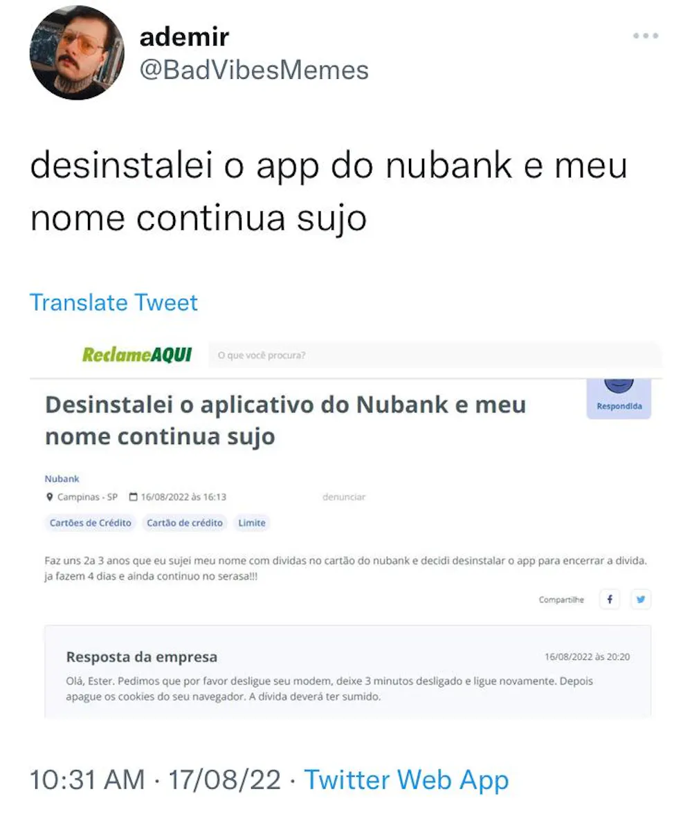 Hoje recebi um meme do app NuBank no Reclame Aqui